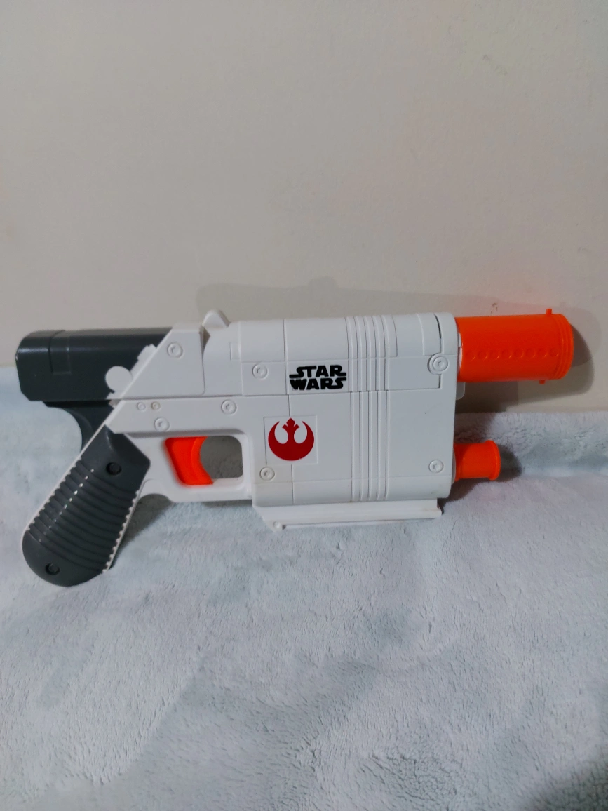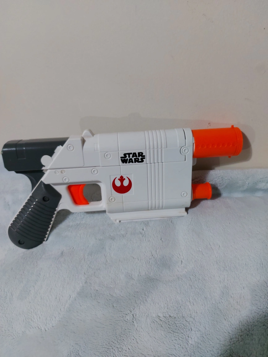 Nerf blaster, Star Wars themed. White and grey colours. Orange accents. Looks like a pistol. Great for kids.