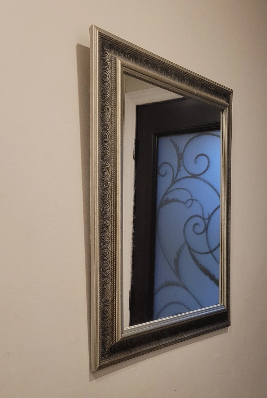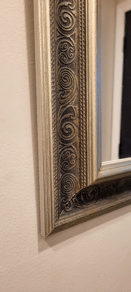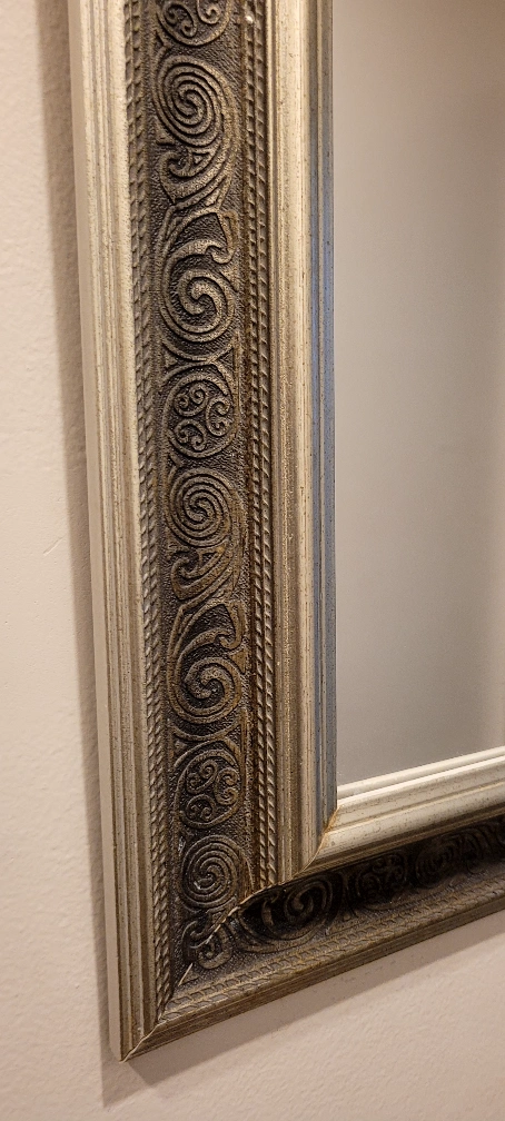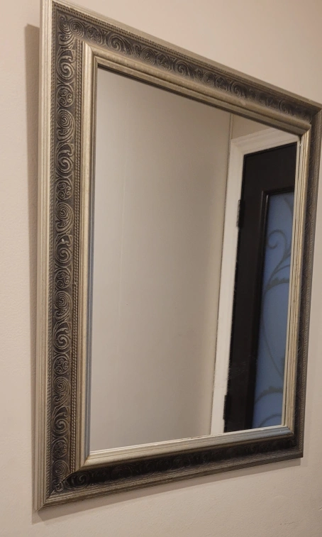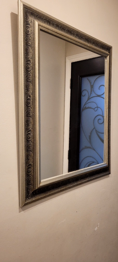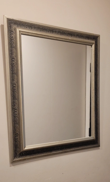 Rectangular mirror. Features an elegant silver and black frame with detailed swirling patterns. Perfect for hallways or bathrooms. Adds a touch of classic style to any room. Width 21" Height 25" Frame 3"