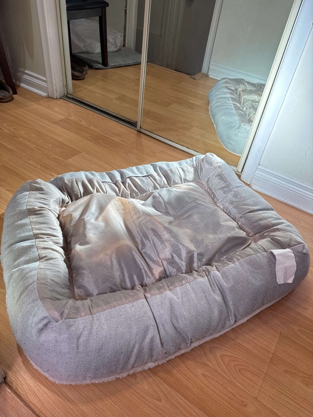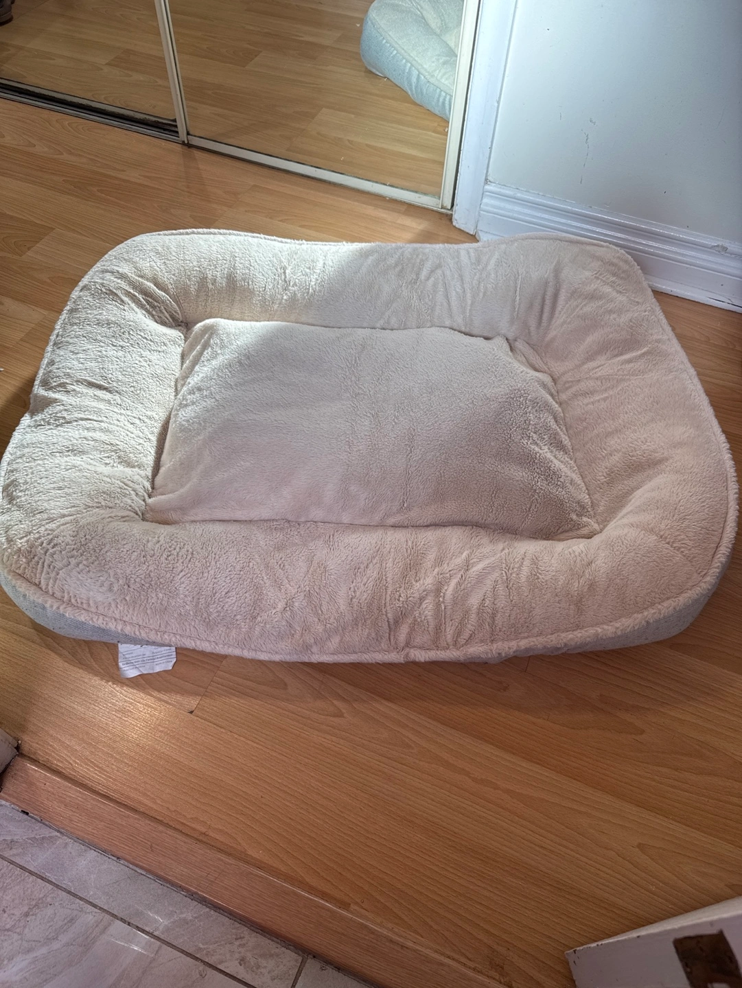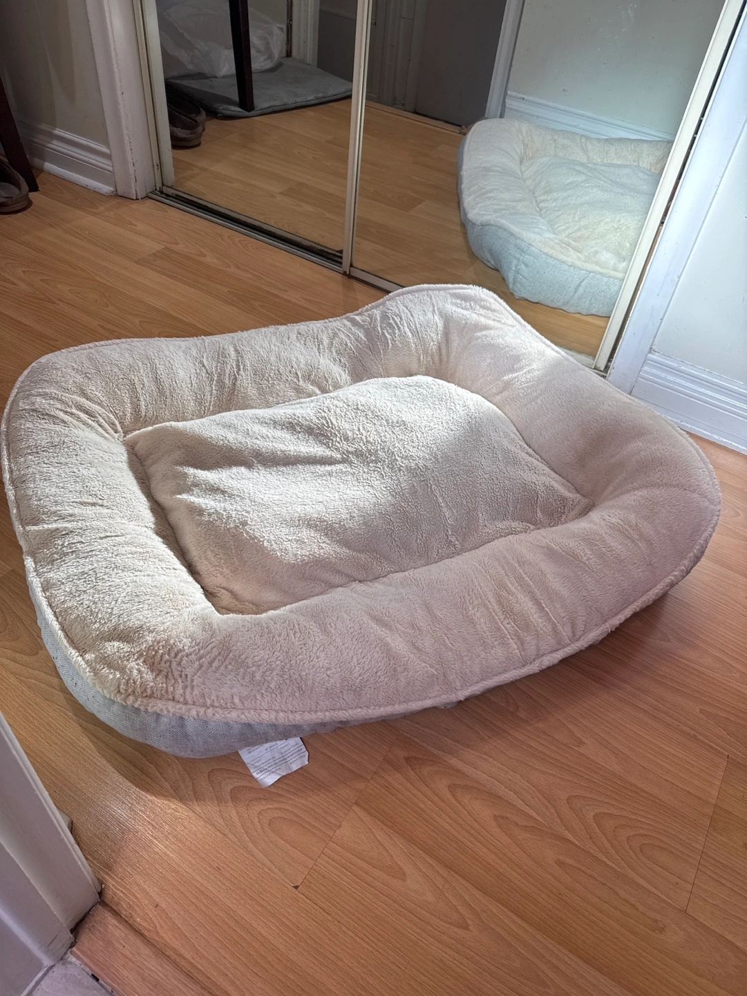 Rectangular pet bed. Cream coloured plush top. Grey fabric sides and bottom. Suitable for small to medium sized pets.