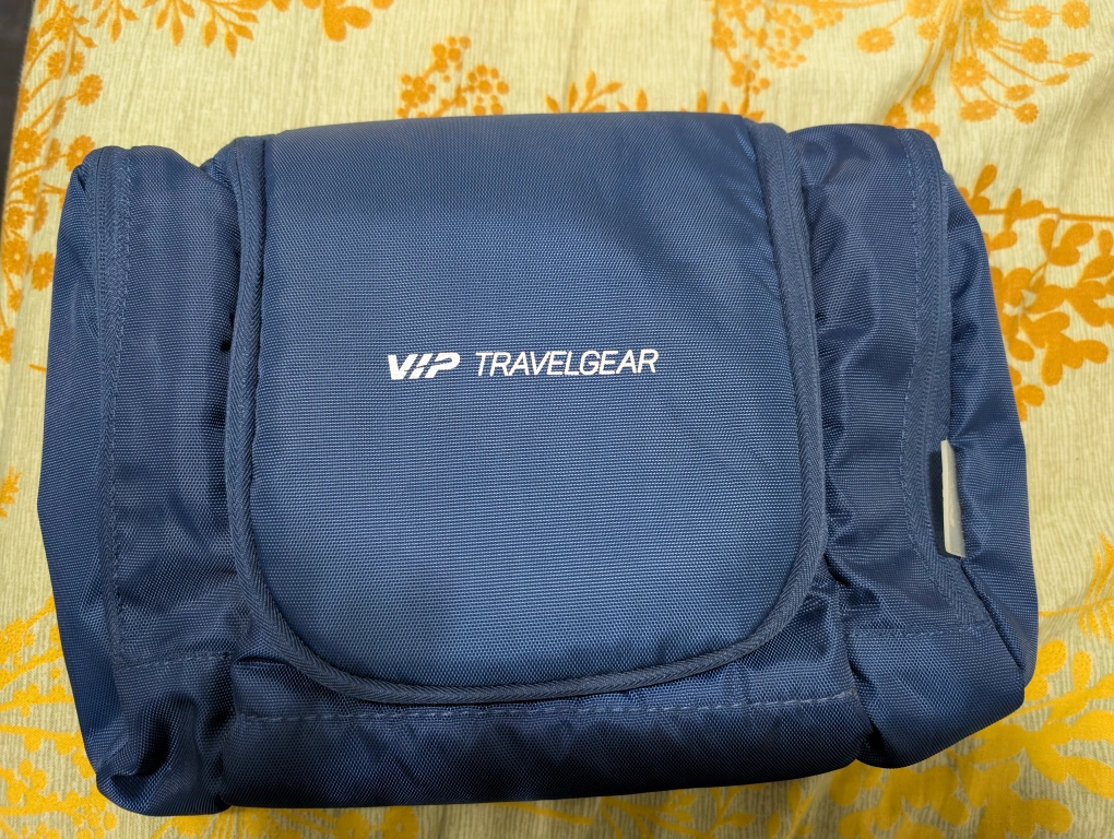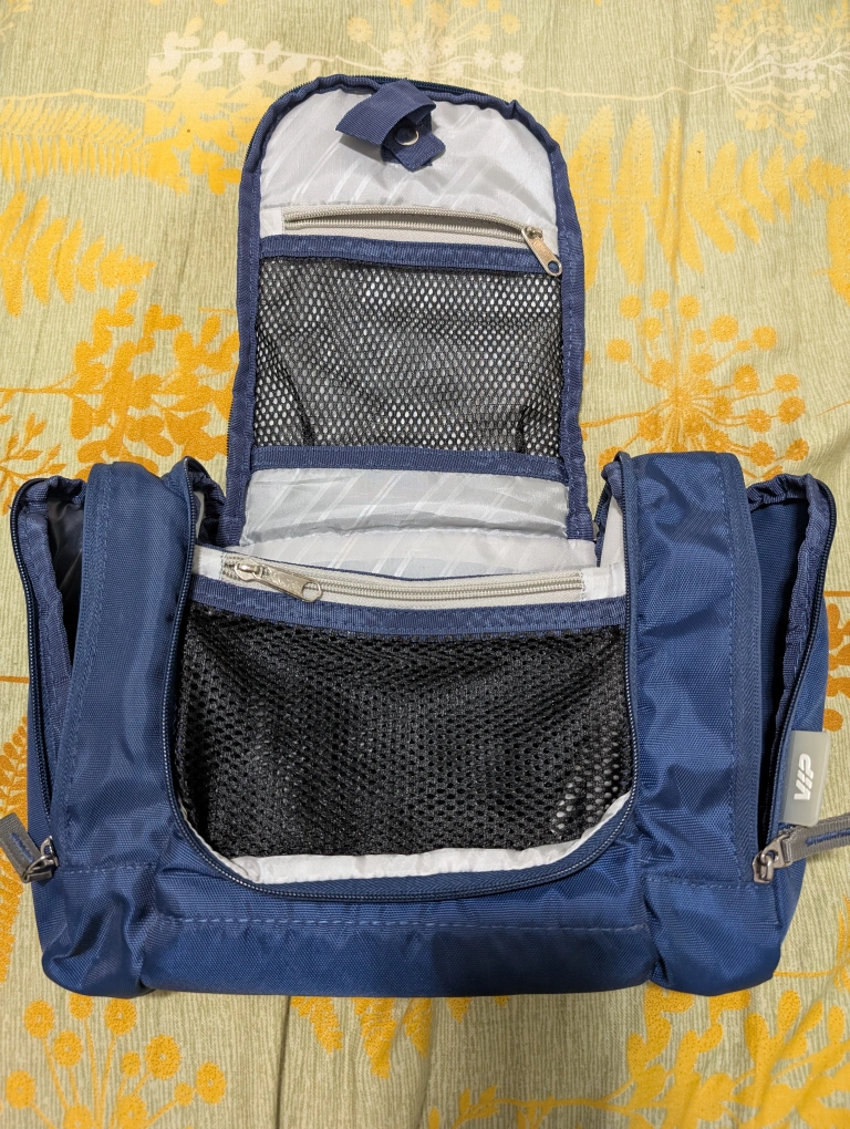 Navy blue toiletry bag. Multiple compartments and zipper closures. Perfect for travel. Hanging loop. Not flimsy. Very good quality. Pick up at 60 John Street @ A&W. Cash only.