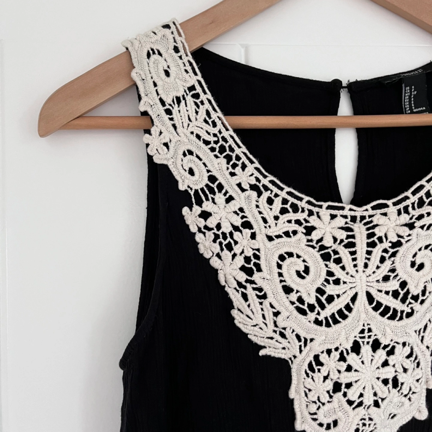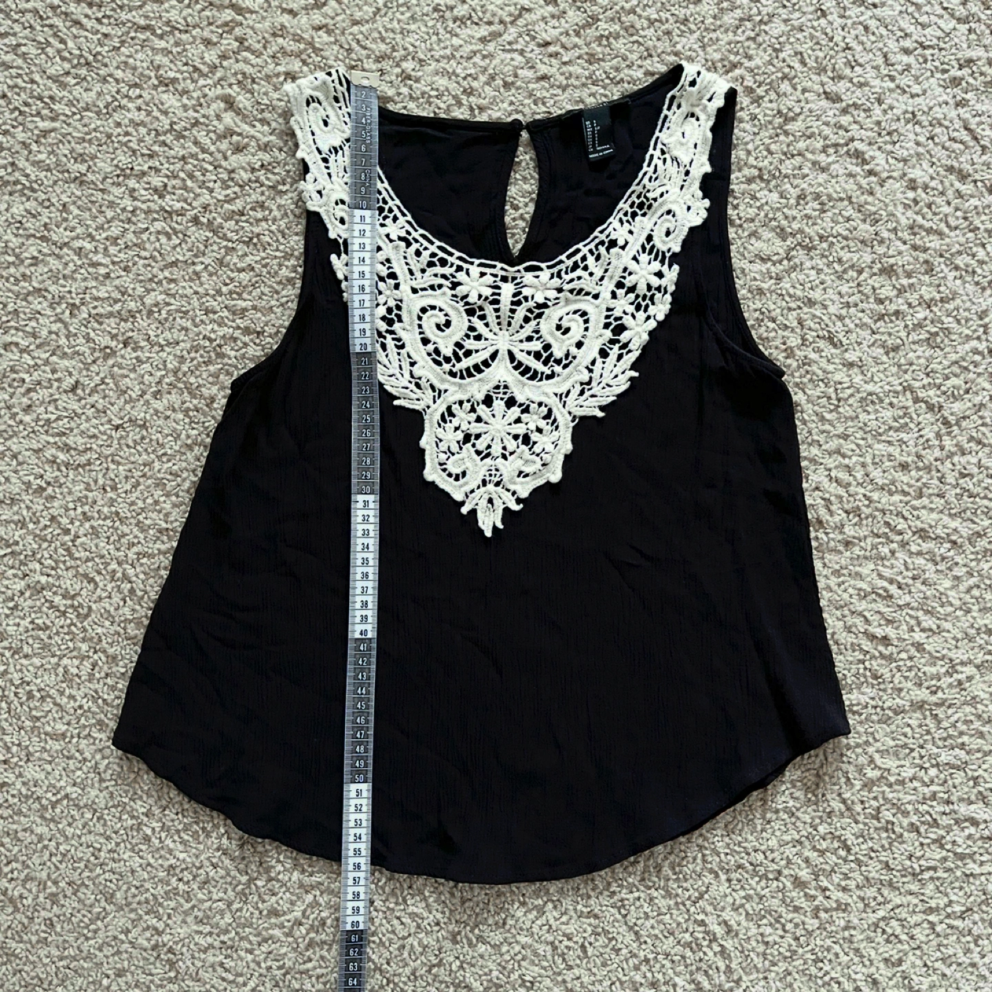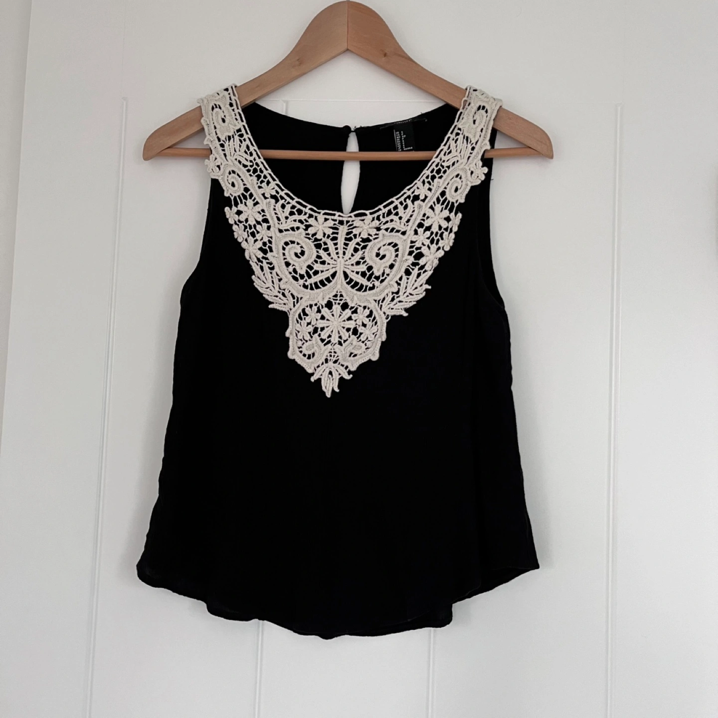 Black sleeveless tank top features a cream coloured lace neckline. Small tear at the back as shown. Size Small.