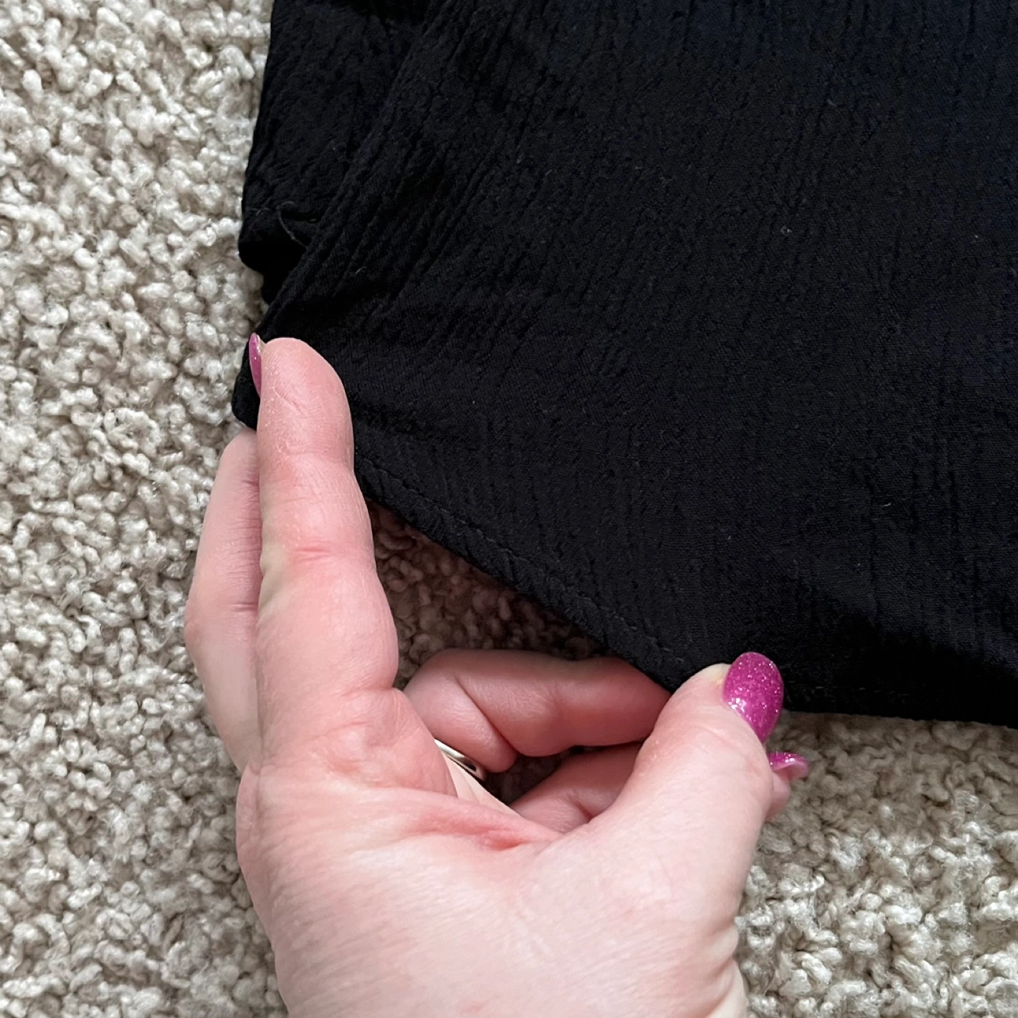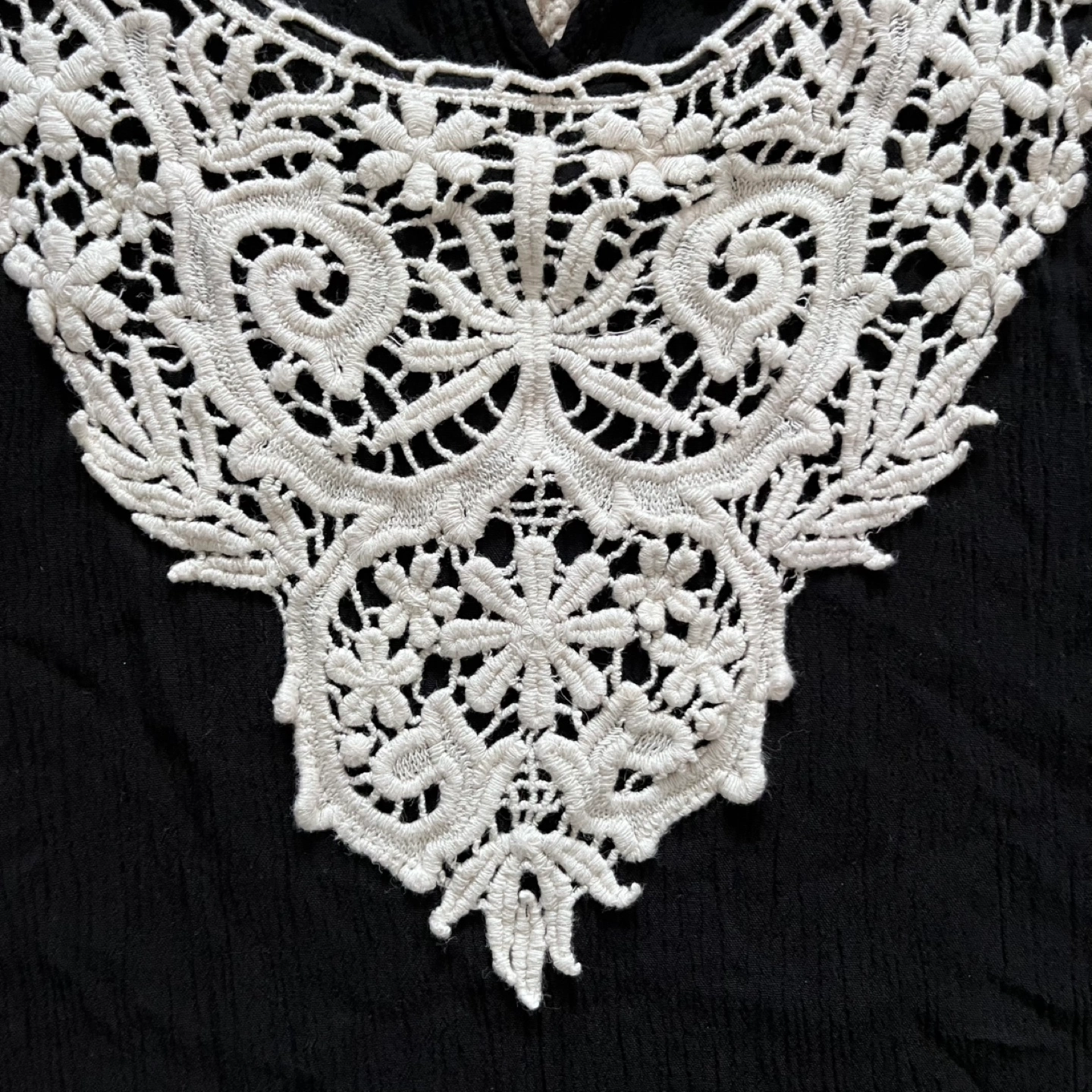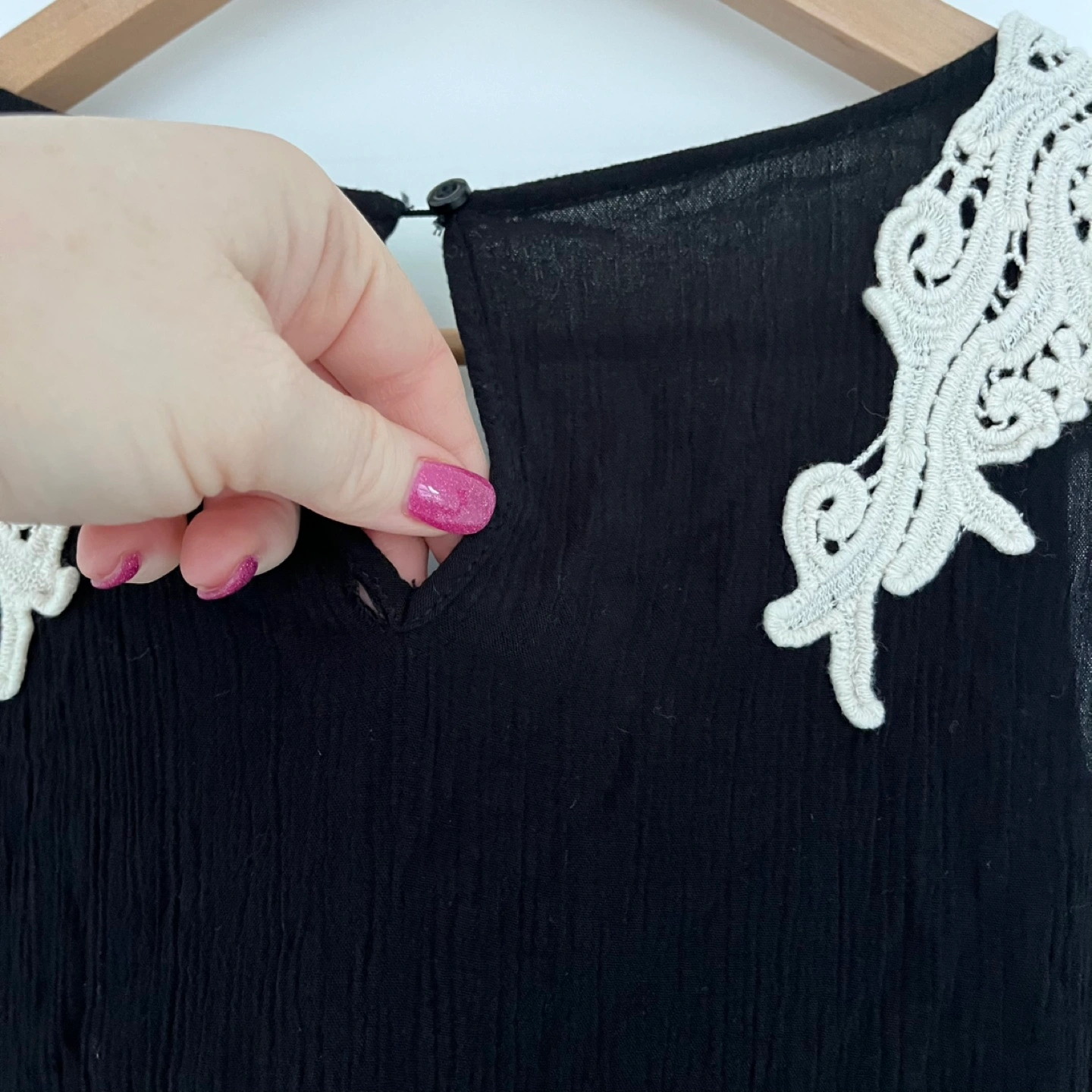 Black sleeveless tank top features a cream coloured lace neckline. Small tear at the back as shown. Size Small.