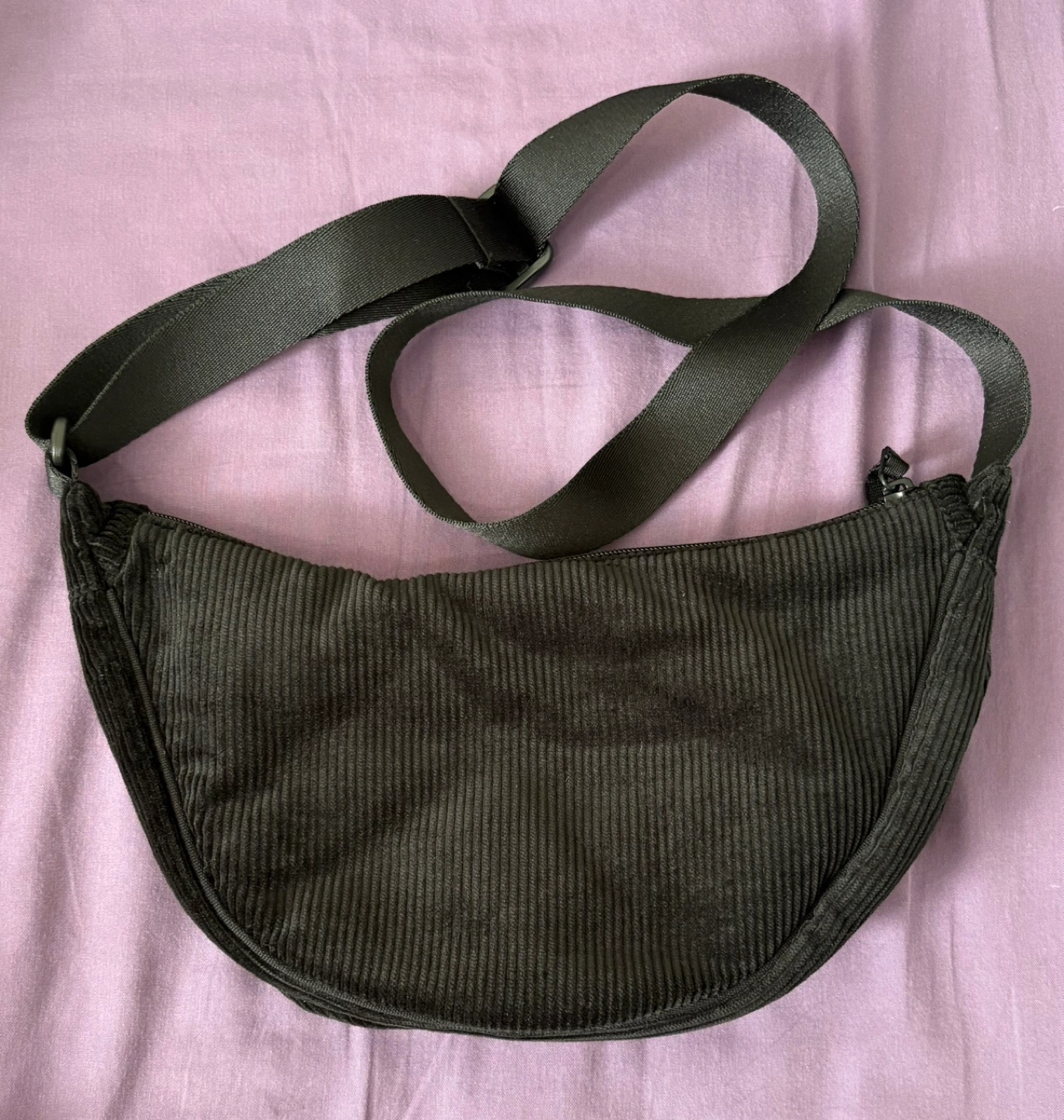 Small black corduroy crossbody bag. Features an adjustable strap and zipper closure. Excellent for everyday use. In excellent Condition. I only used it once.😊