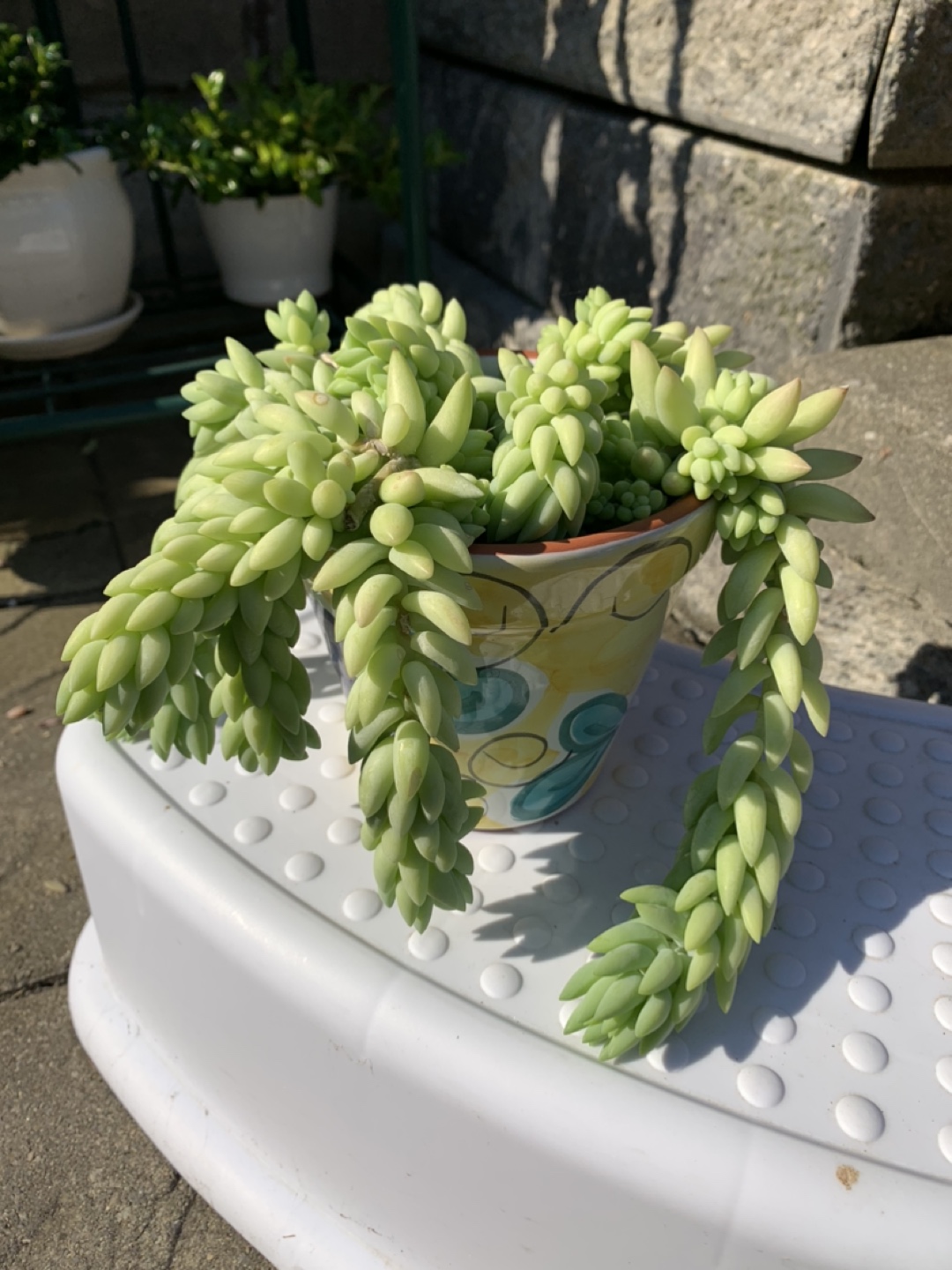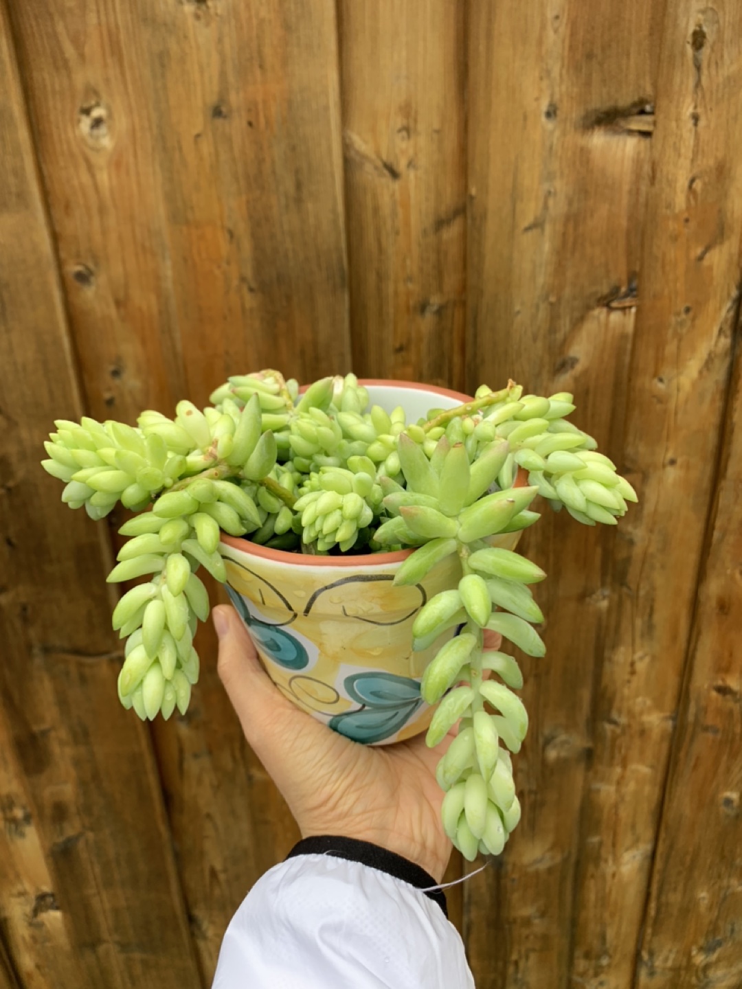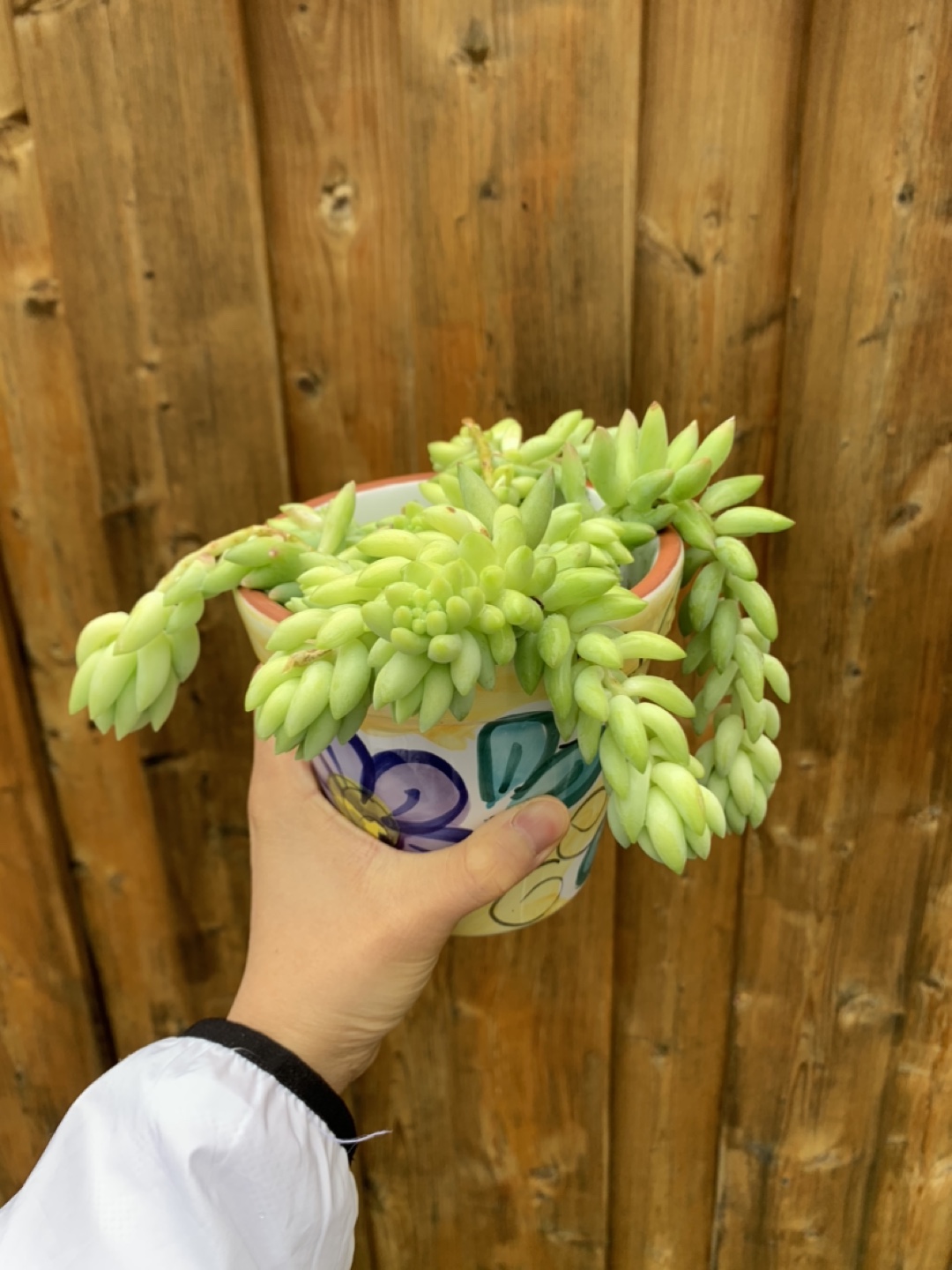 Sedum morganianum, the donkey tail or burro's tail, is a species of flowering plant in the family Crassulaceae, native to southern Mexico. Super cute ceramic pot also! Pick up around islington station.