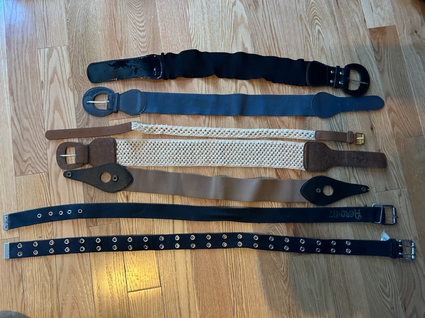 Assortment of women's belts, various colours and materials. Includes stretchy belts, woven belts, and belts with eyelets. Good for various outfits.