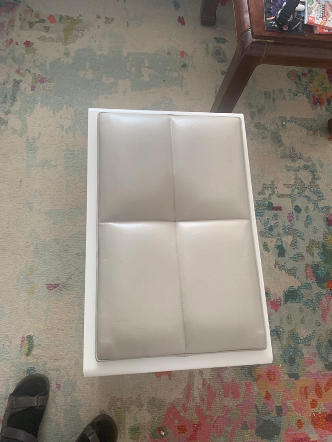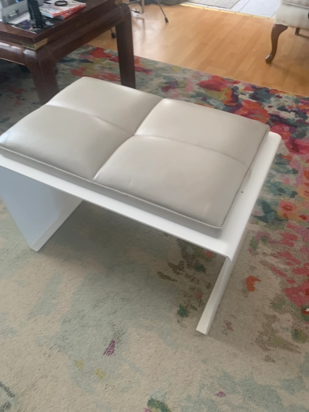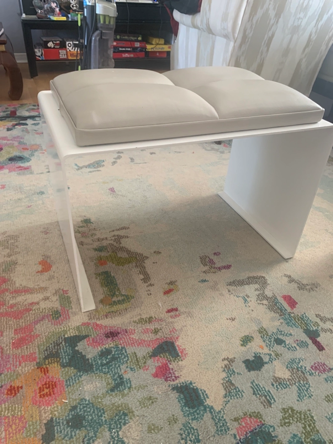 Stylish modern bench. White frame, light gray genuine leather seat. Perfect for entryway or bedroom. Minimalist design.