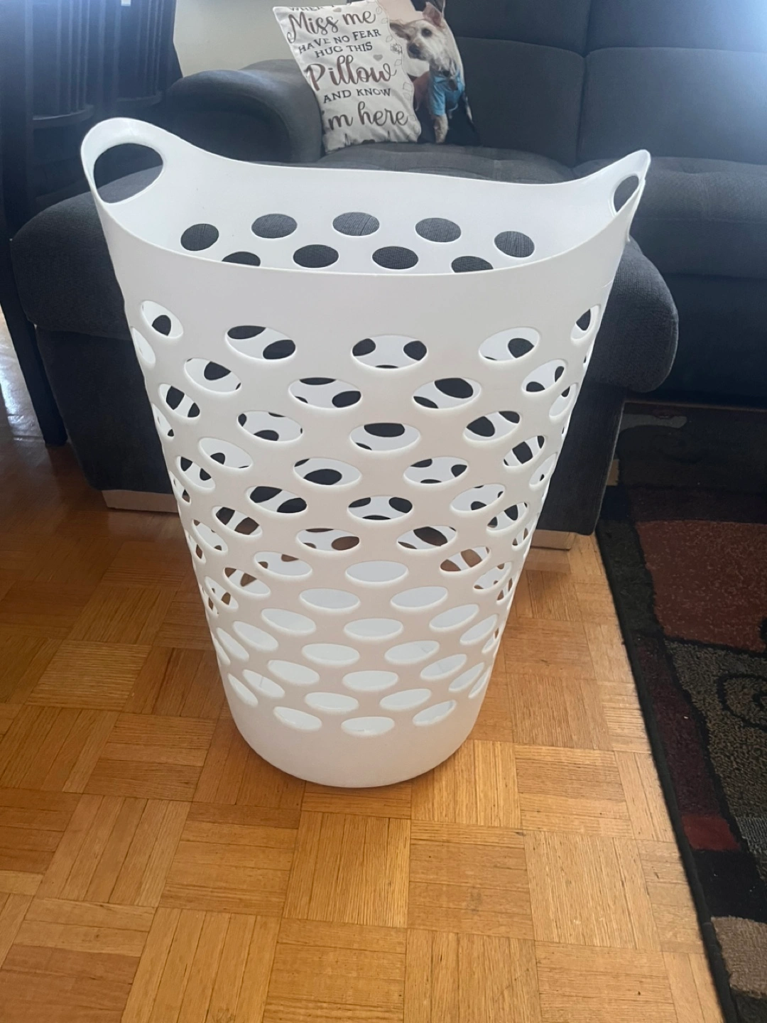 Large, tall white plastic laundry hamper. Features cut-out holes for ventilation. Convenient carry handles.