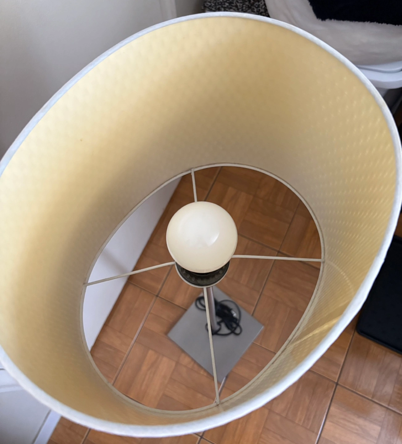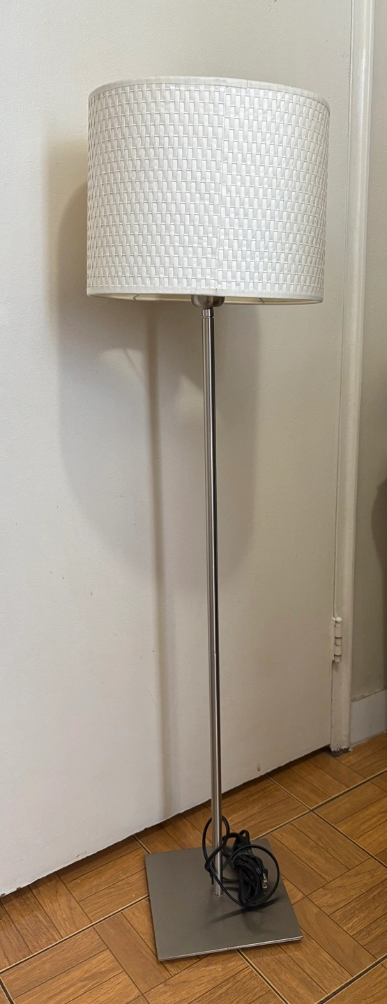 Ikea ALANG floor lamp Adjustable Height. silver metal stand, white woven shade. Great for living room or bedroom. Minimalist design. In good condition.