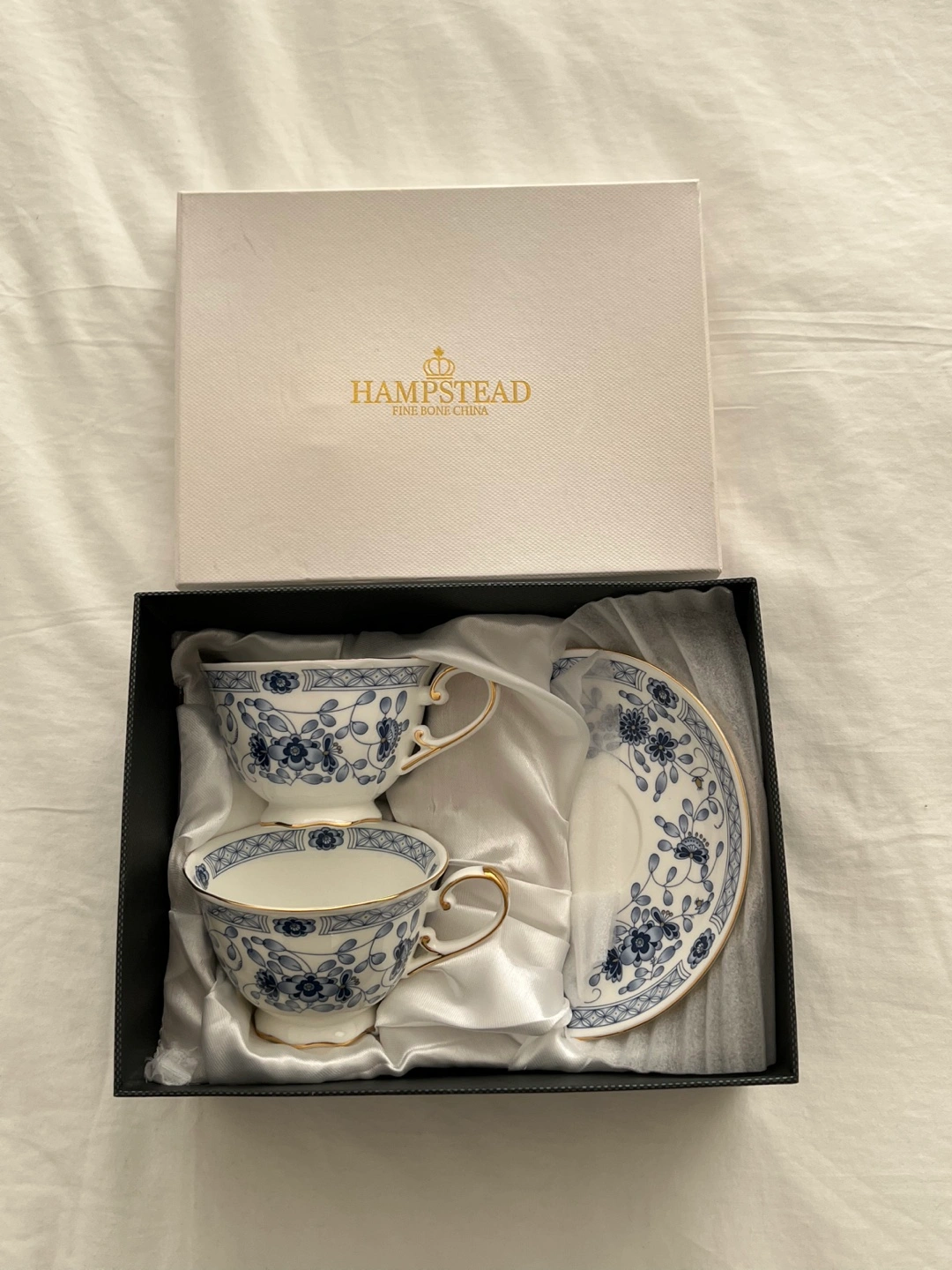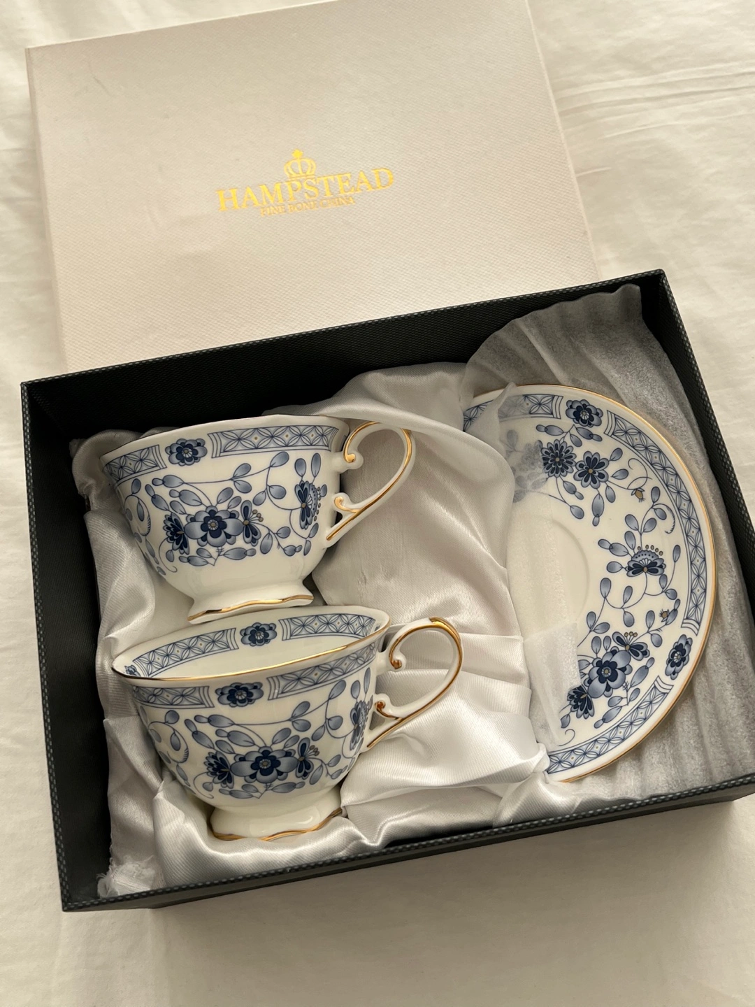 Elegant teacup and saucer set. Two teacups and two saucers. Blue and white floral pattern. Gold detailing. Comes in original box. Great for gift.