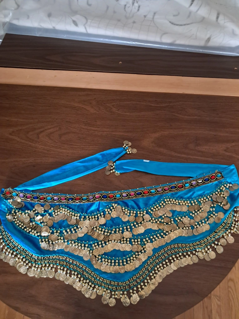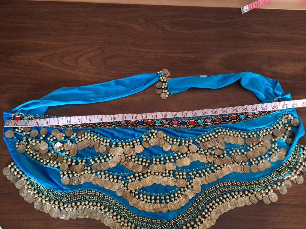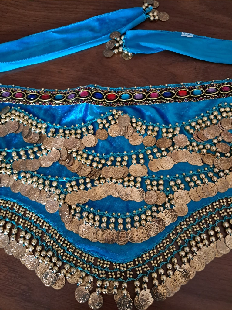 Beautiful turquoise belly dance hip scarf. Features gold coins and colourful beads. Approximately 27 inches long. Great for performances or practice.