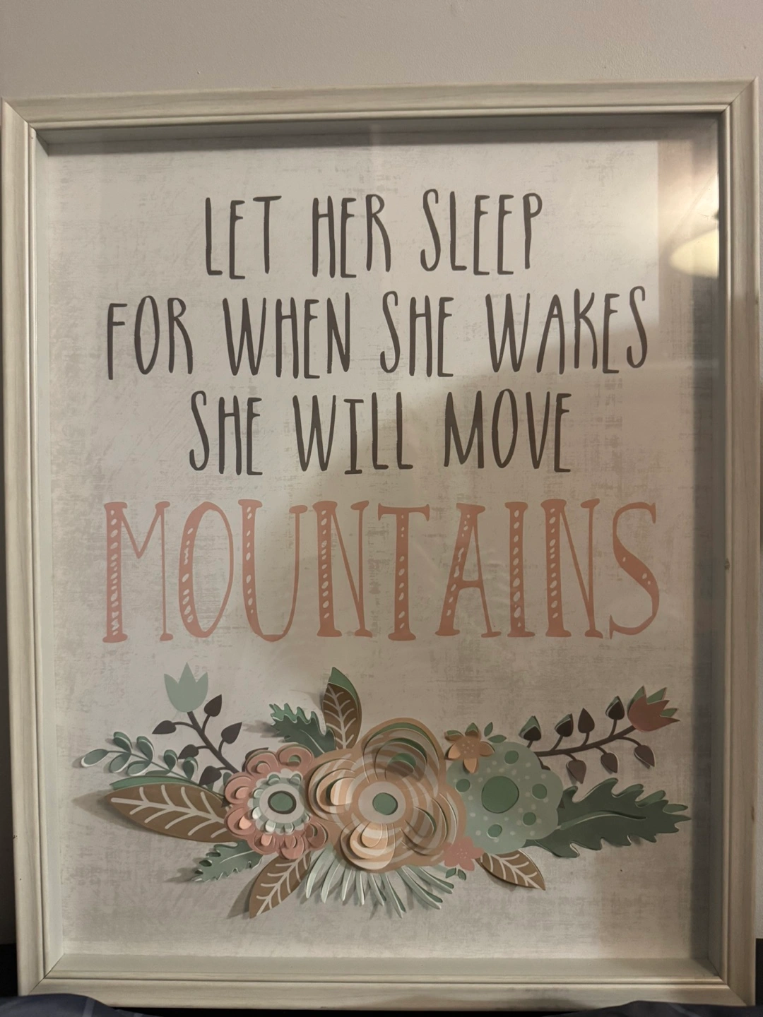 Framed wall decor. Features a quote and floral design. Neutral colours. Perfect for bedroom or nursery.