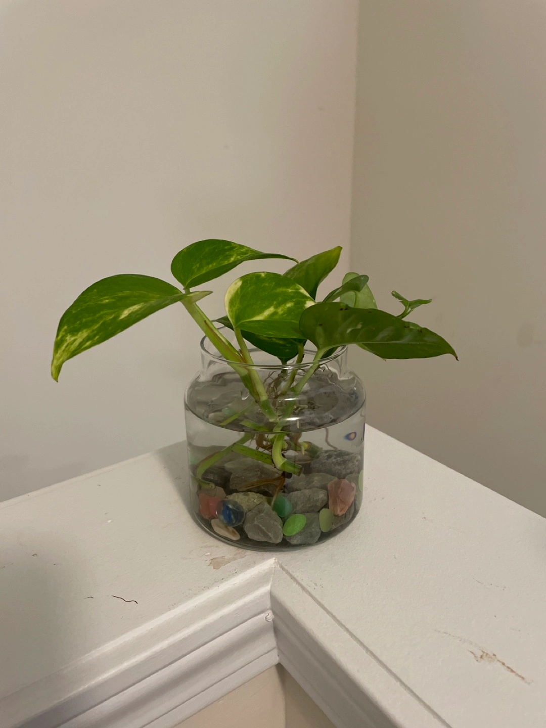 Healthy pothos cutting in water propagation. Small colourful pebbles for weight. Roots growing nicely. Ready for planting.