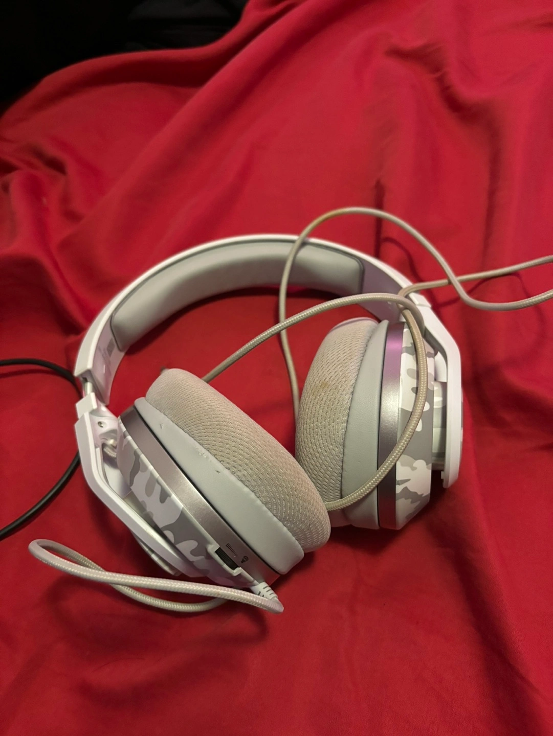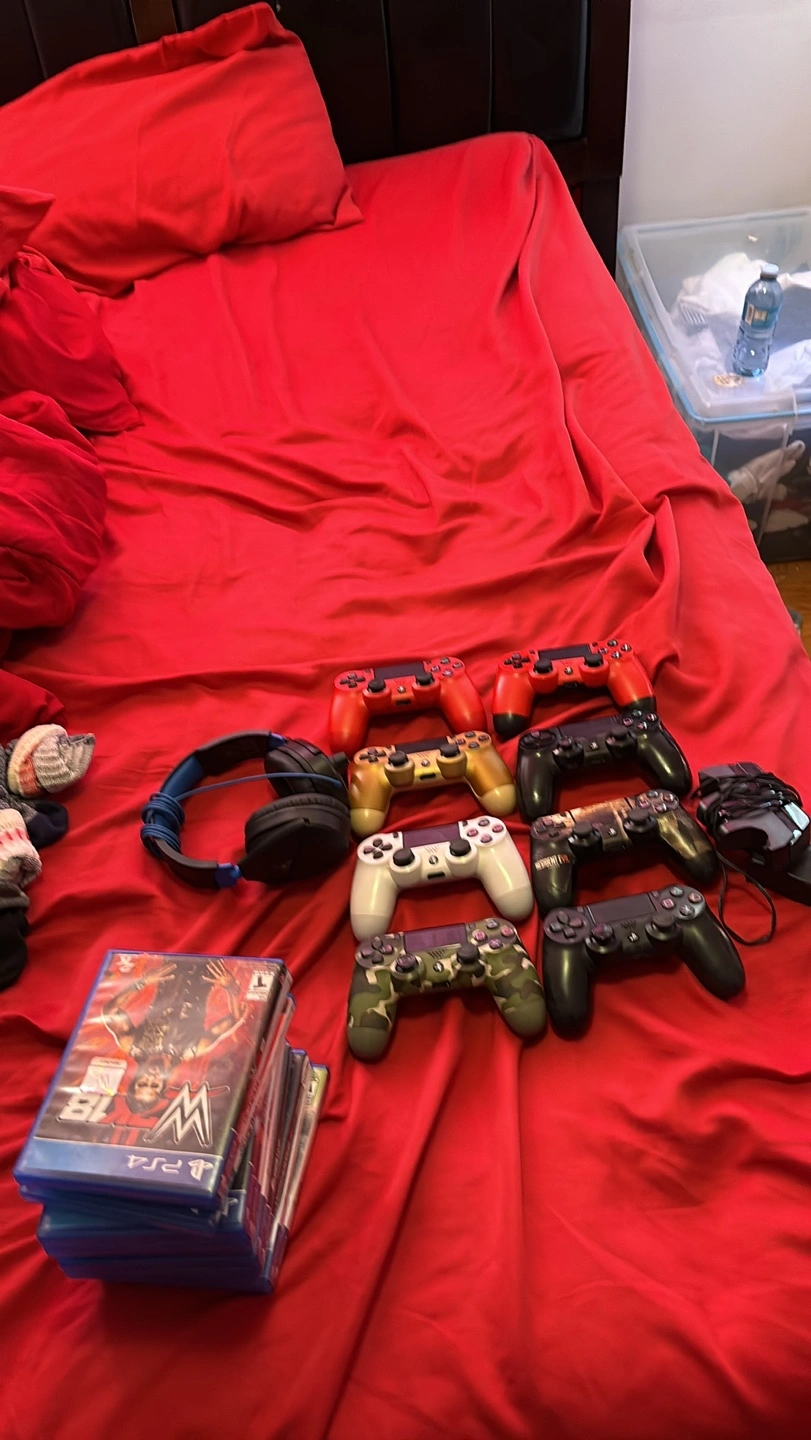 PlayStation 4 console, two red controllers, and a white camouflage-patterned headset. Great for gaming. Includes all necessary cables.