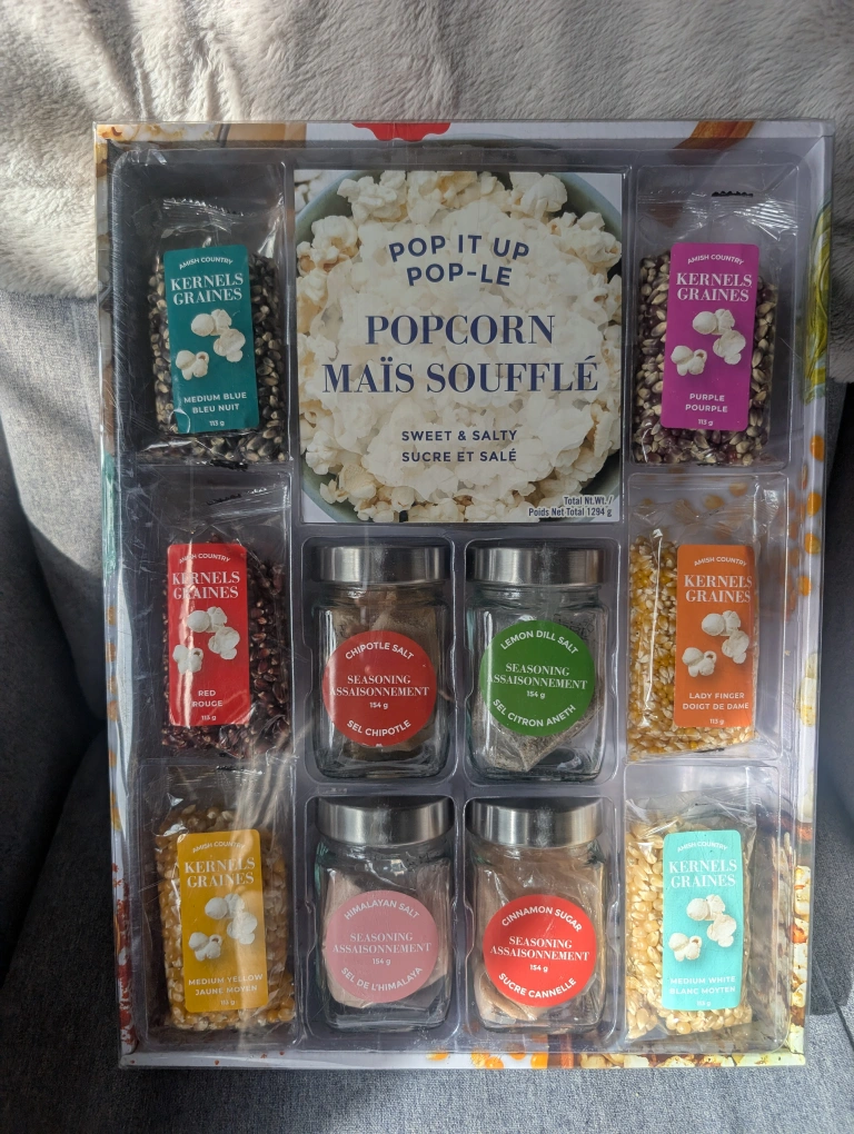 Popcorn making kit. Includes various popcorn kernels and seasonings. Sweet and salty flavours. Was a gift at Christmastime so definitely still fresh!