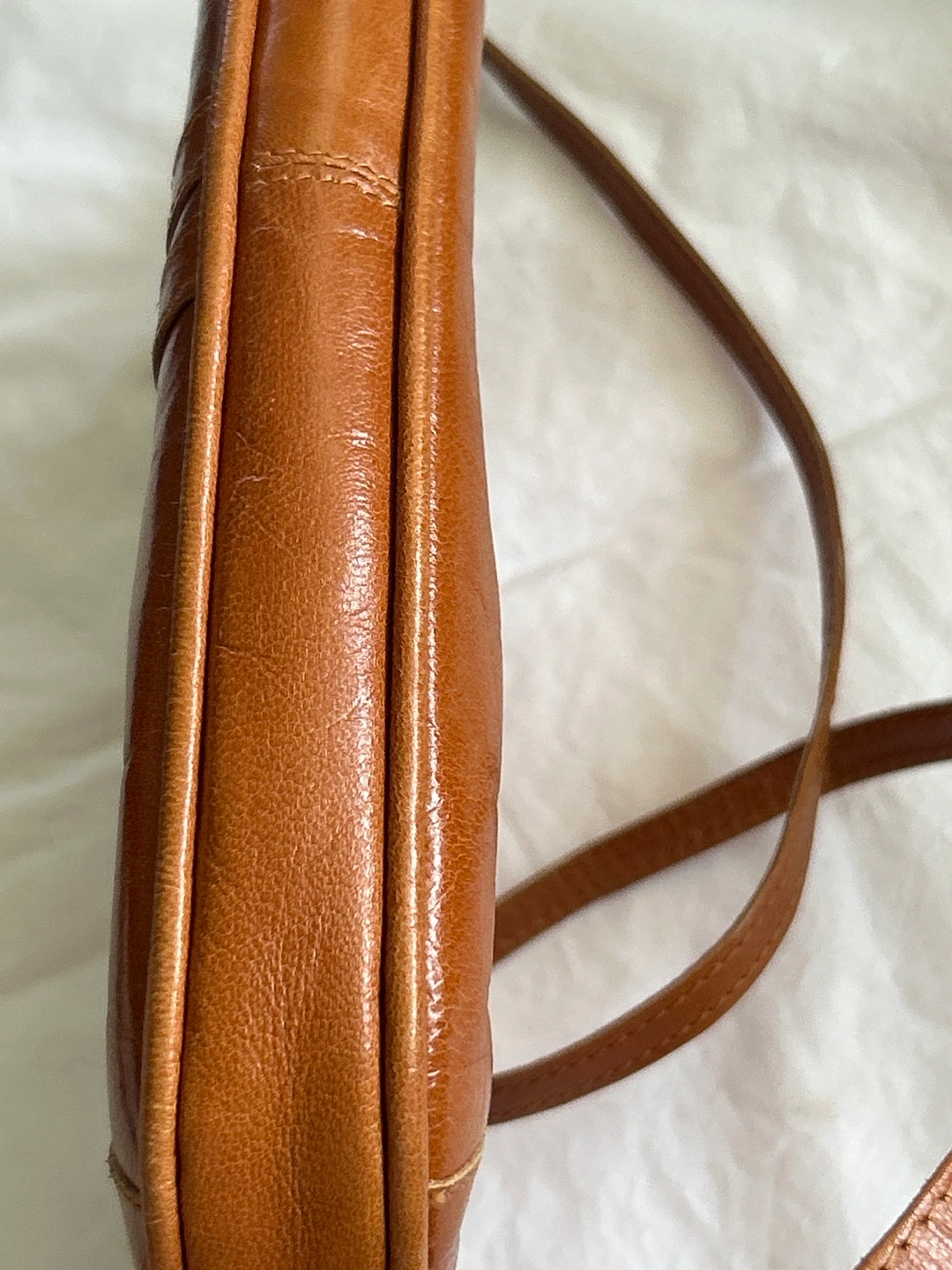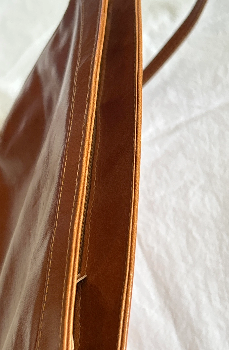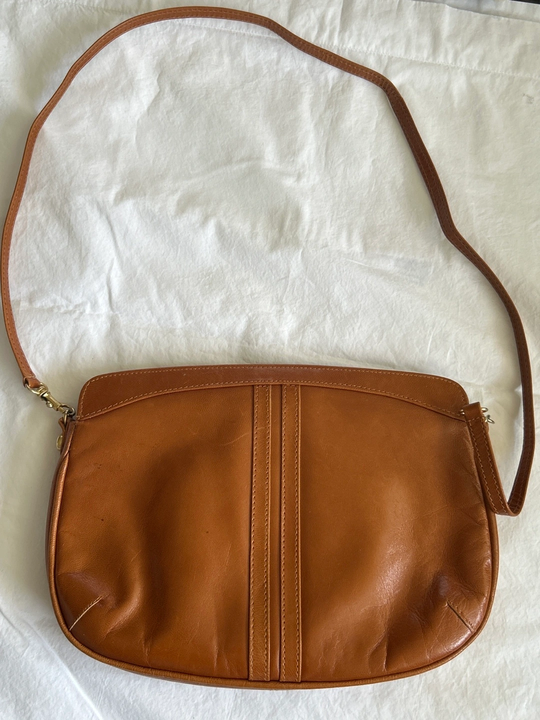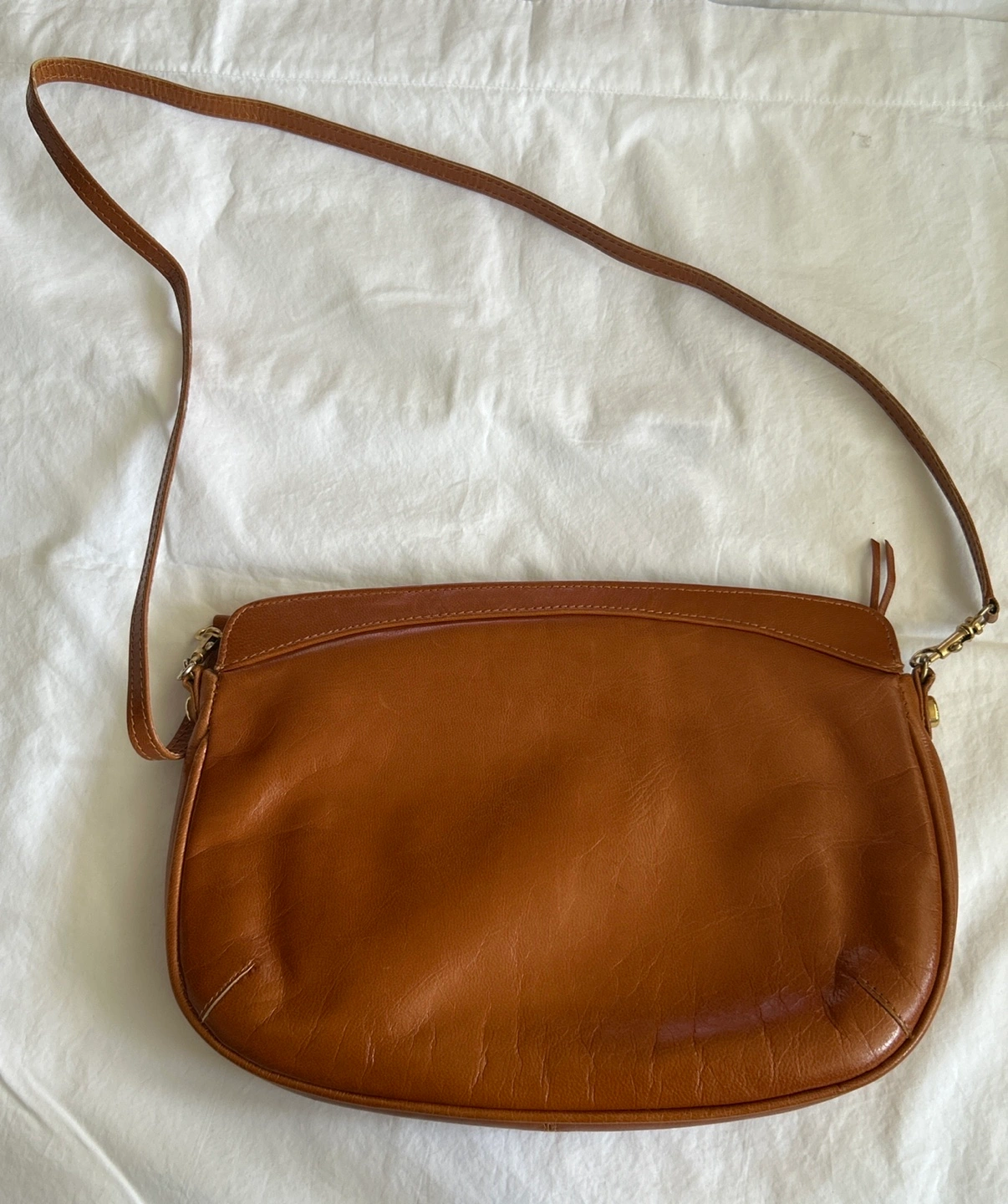Pre-owned vintage leather shoulder bag. Cognac brown colour. Features a long shoulder strap (not adjustable) and zipper closure. Interior includes a small zippered pocket. Classic design, great for everyday use. Clean and in excellent condition. Smoke/Pet free home. Cash & Pick up only.