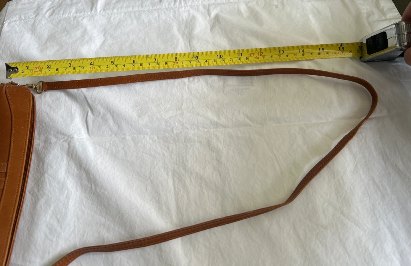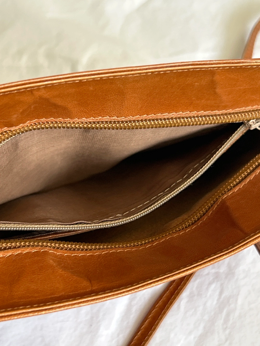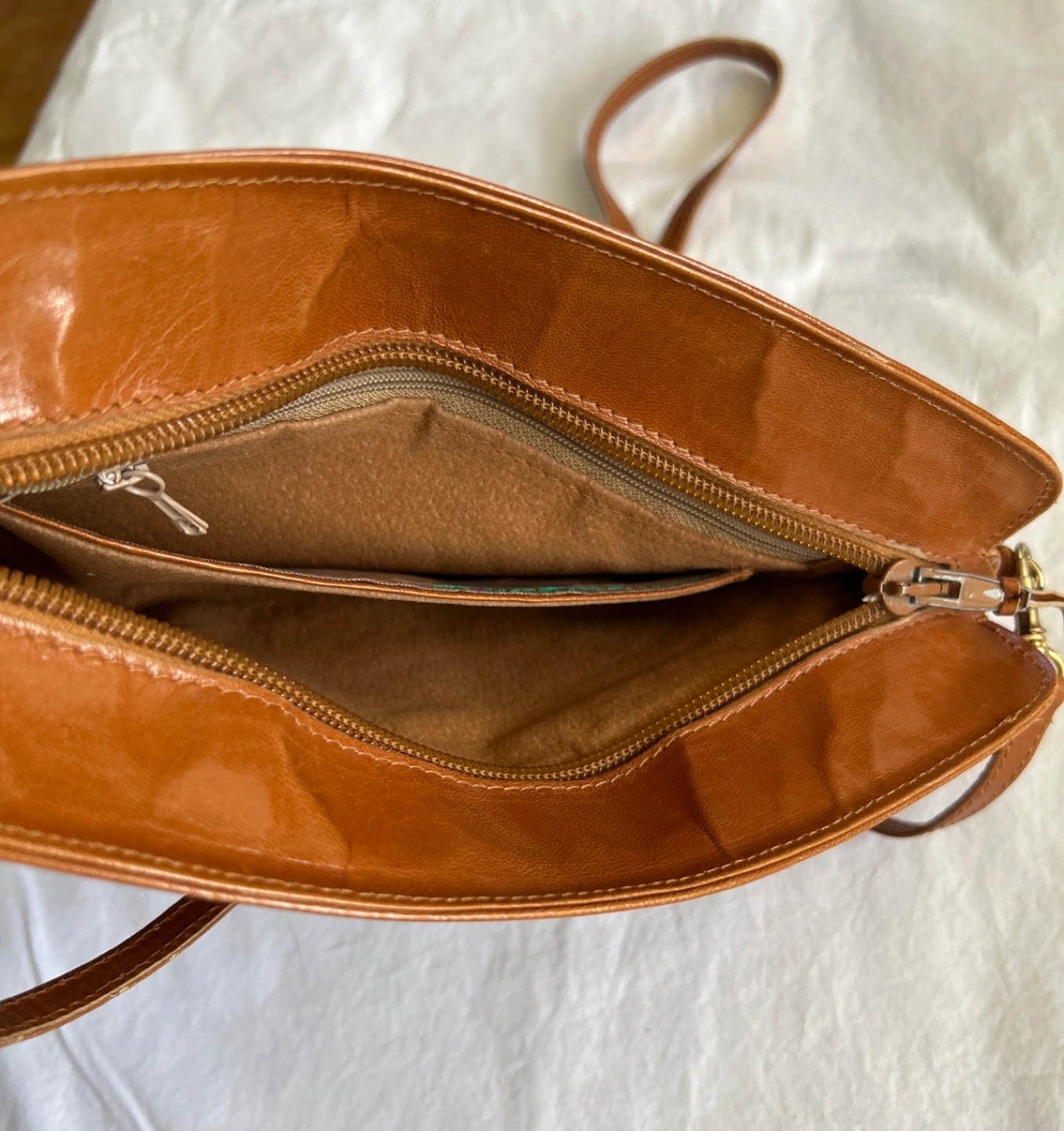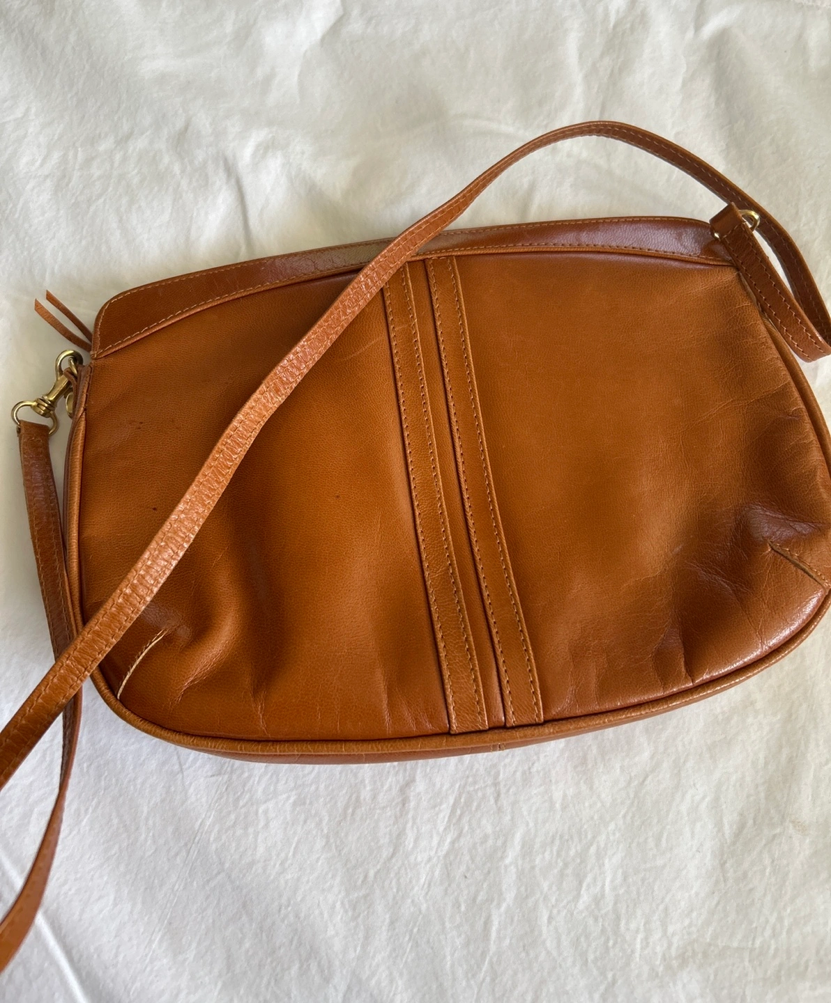 Pre-owned vintage leather shoulder bag. Cognac brown colour. Features a long shoulder strap (not adjustable) and zipper closure. Interior includes a small zippered pocket. Classic design, great for everyday use. Clean and in excellent condition. Smoke/Pet free home. Cash & Pick up only.