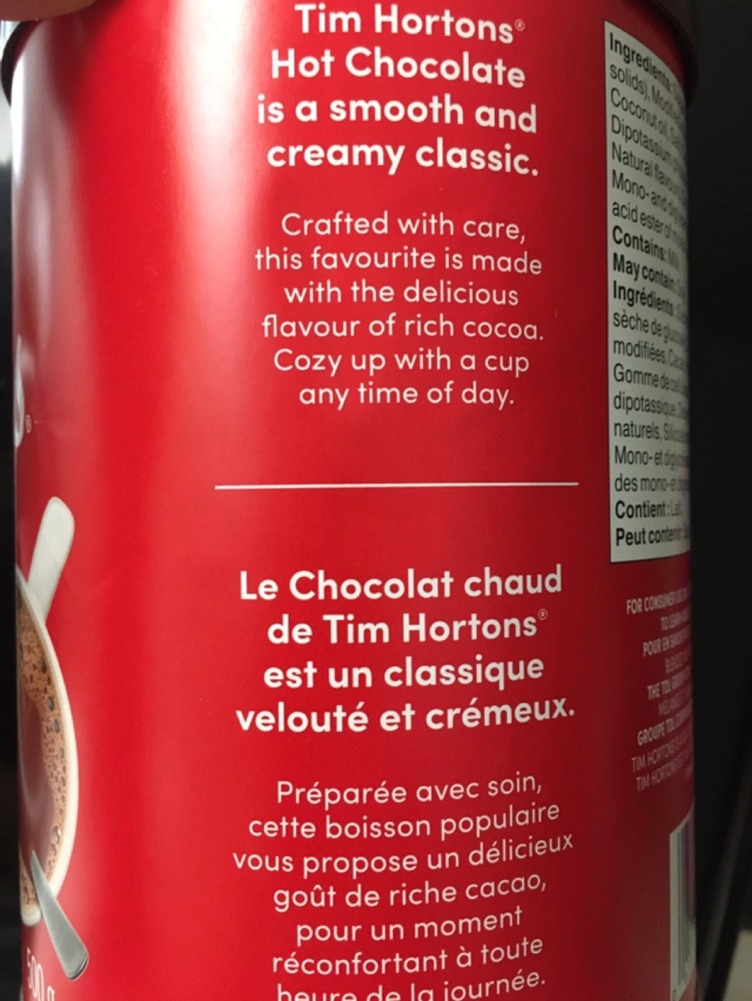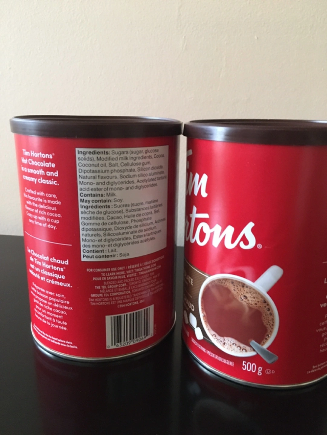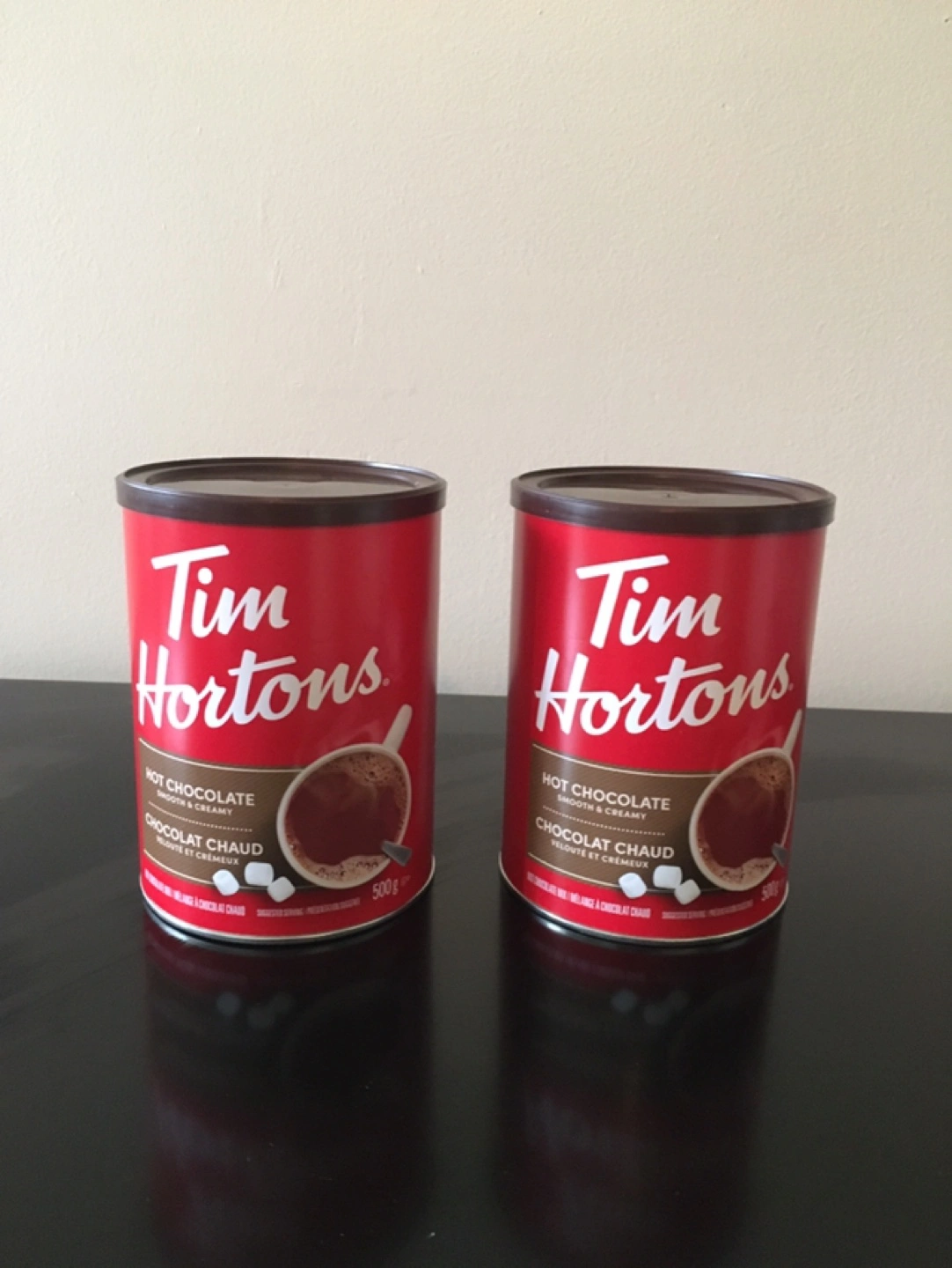 Two 500g cans of Tim Hortons hot chocolate. Smooth and creamy. Made with real cocoa. Enjoy a rich, flavourful cup anytime. Each for 5$ If you order more than 4 can Price for 4:50 each Pick up:down town west (adelaide)