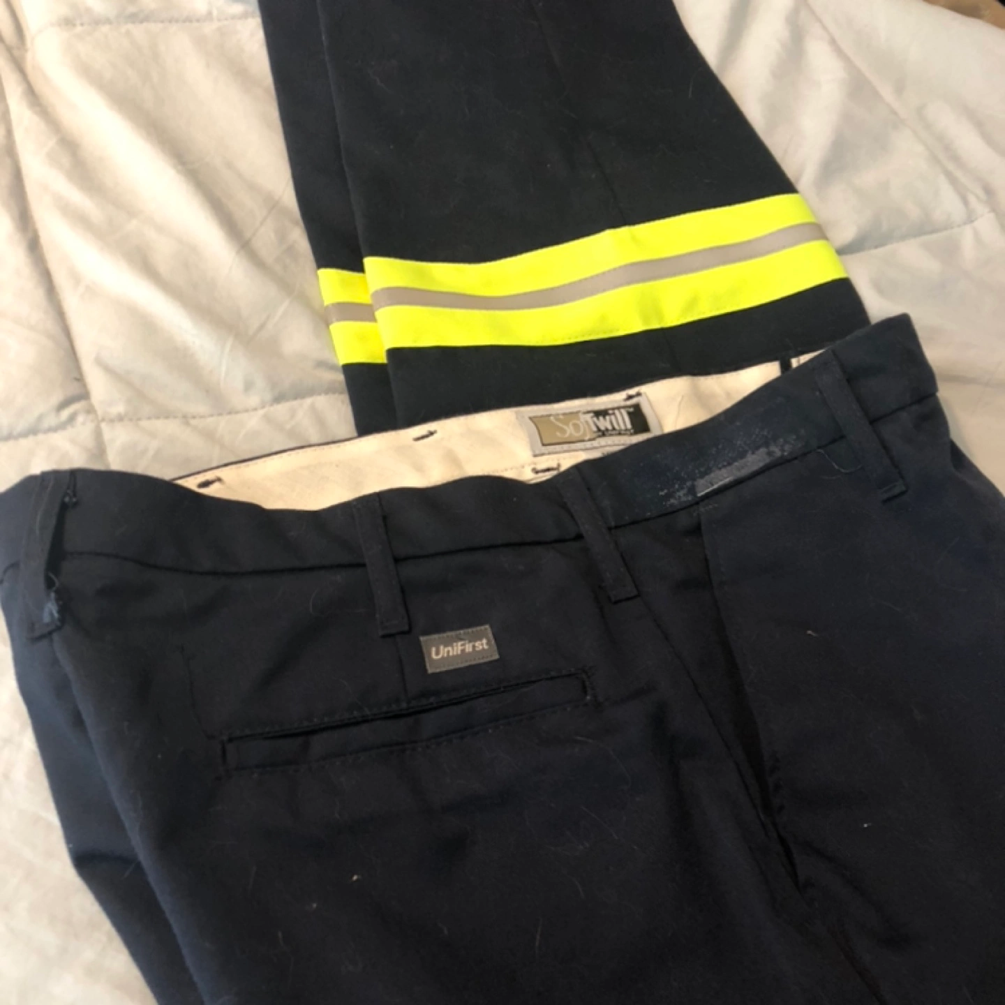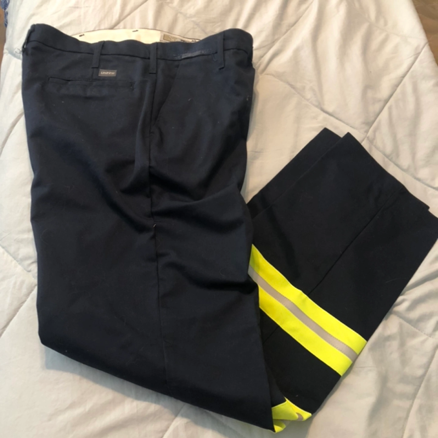 Men's navy work pants. Size 34x34. Reflective tape accents. 65% polyester, 35% cotton. High vis on legs work pant