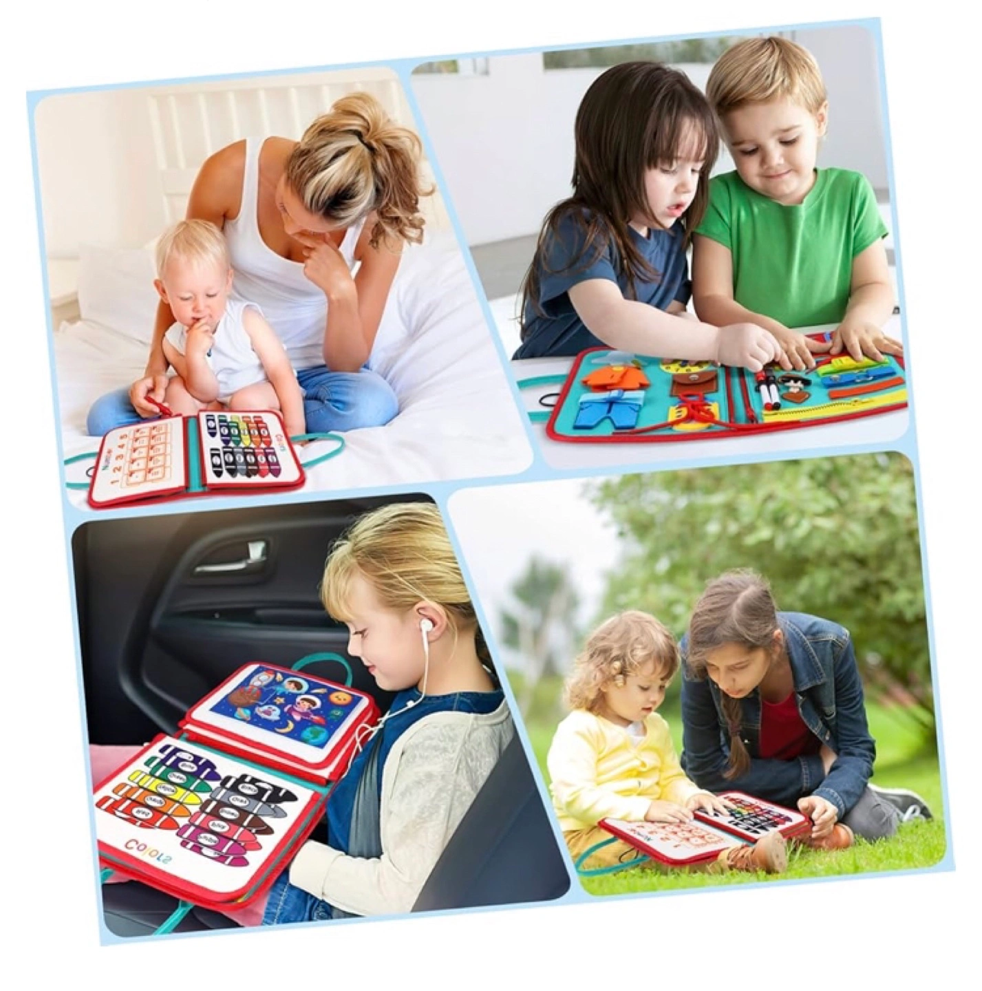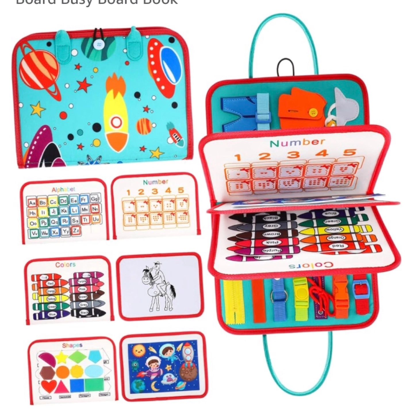 Interactive learning toy. Features pages with numbers, alphabet, colours, shapes, a clock, and fasteners. Great for travel. Portable design with carrying handles.
