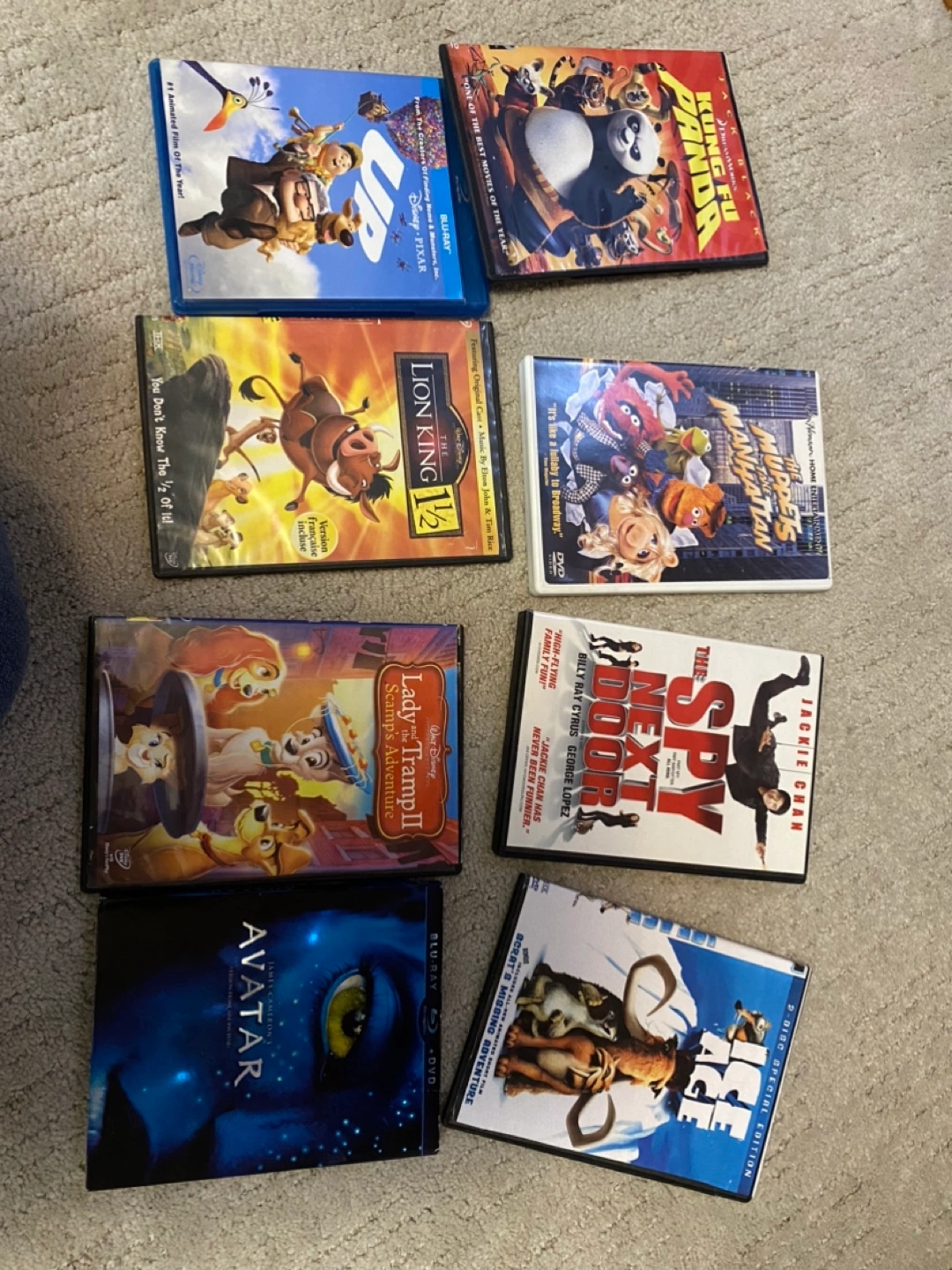 Collection of eight pre-owned DVDs and Blu-rays. Includes various animated and live-action films suitable for family viewing.