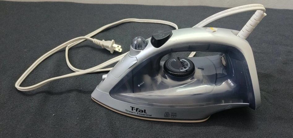 Used T-fal Steam Essential iron. Features a water tank and adjustable steam settings. Includes power cord.