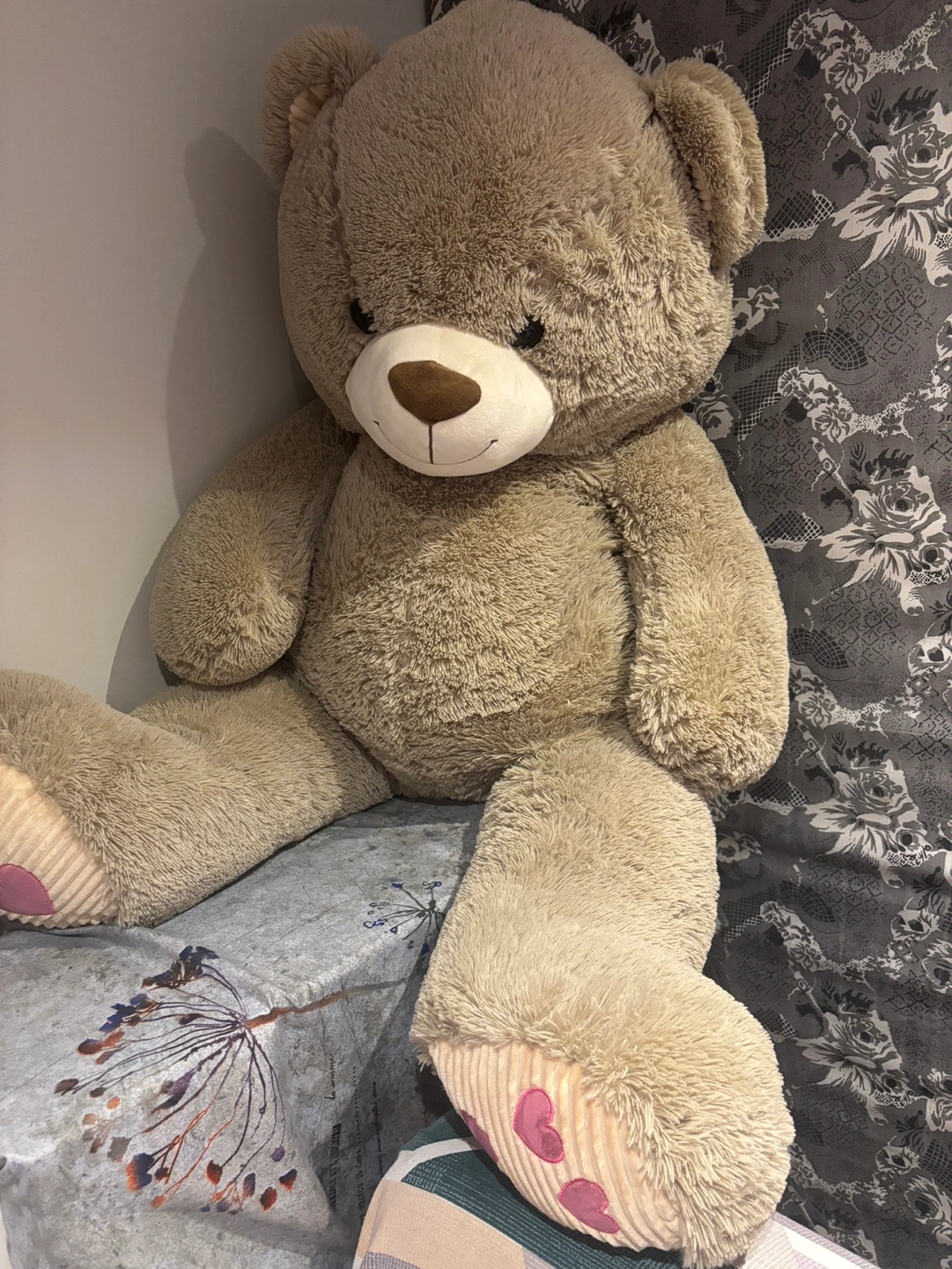 Large beige teddy bear. Soft fur. Pink heart details on paws. Great for cuddling or decoration. Moving sale