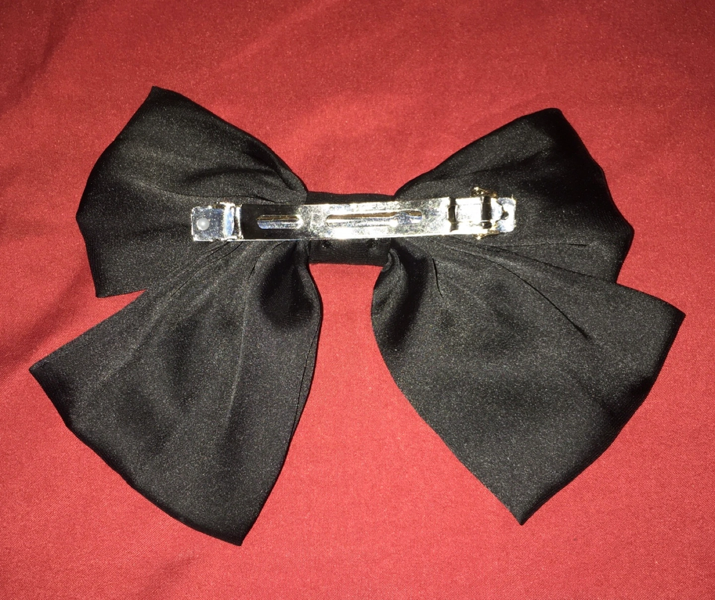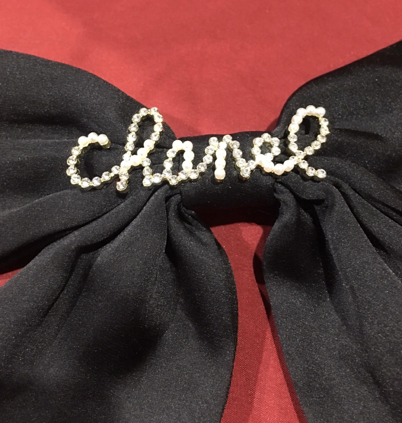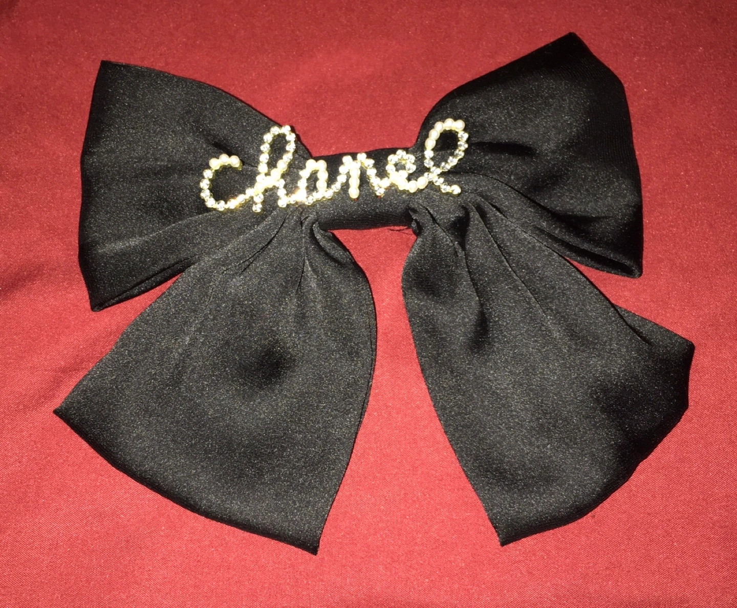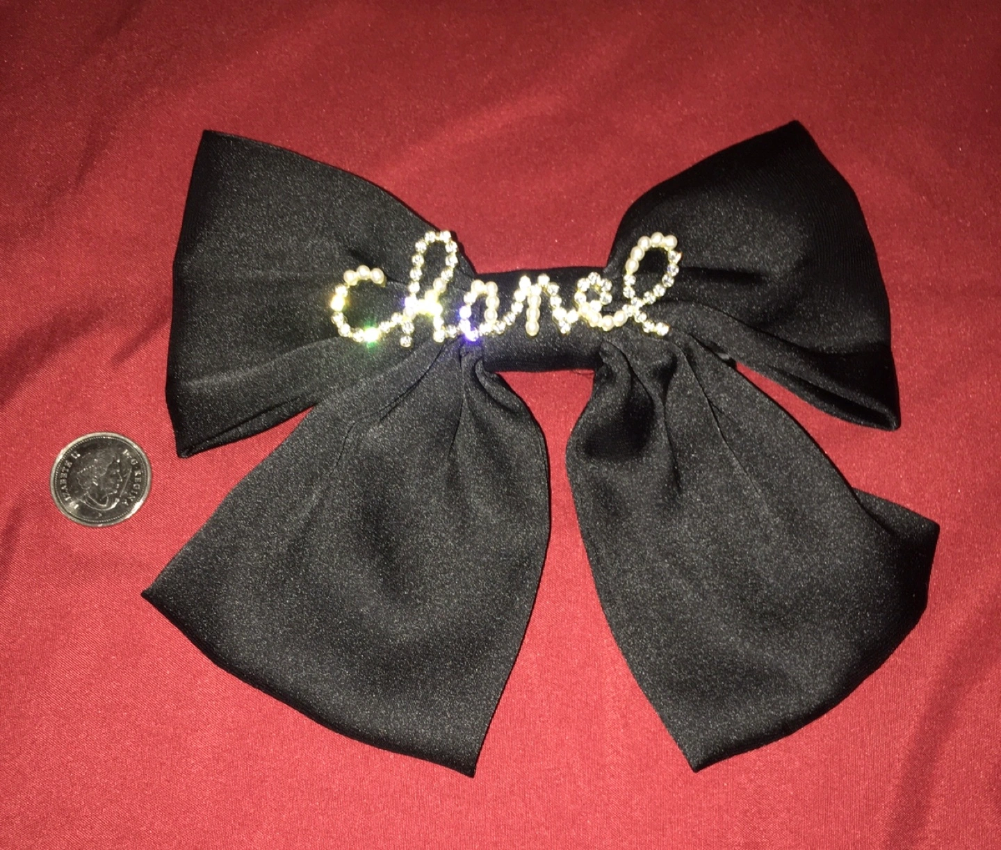 Large black satin hair bow. Features the word 'Chanel' in rhinestones .Clip closure. Perfect for adding a touch of elegance to any outfit. Inspired/alternative/fashion Pick up at Southgate Mall after 6pm on weekdays, weekends between 5-6pm Cash only