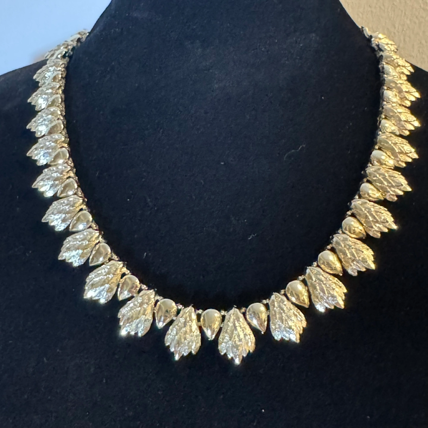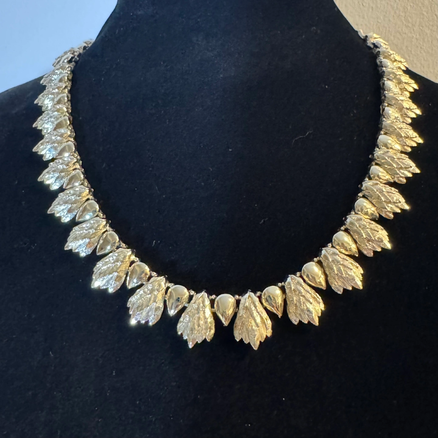 1950s Signed Coro Pegasus Silver Bib Choker Vintage Necklace with Teardrop Pendants This stunning Coro necklace features a bib / collar / wreath design adorned with shimmering silver tone teardrop pendants, arranged in a graceful, graduated pattern. The textured surface of each pendant enhances its reflective quality, making it a captivating accessory for any occasion. Stunning piece from Coro’s Pegasus line from the 1950s in pristine condition. This item is in lovely vintage condition and stored in a smoke and pet free home. Please see photos and let me know if you have any questions. Length: 16”