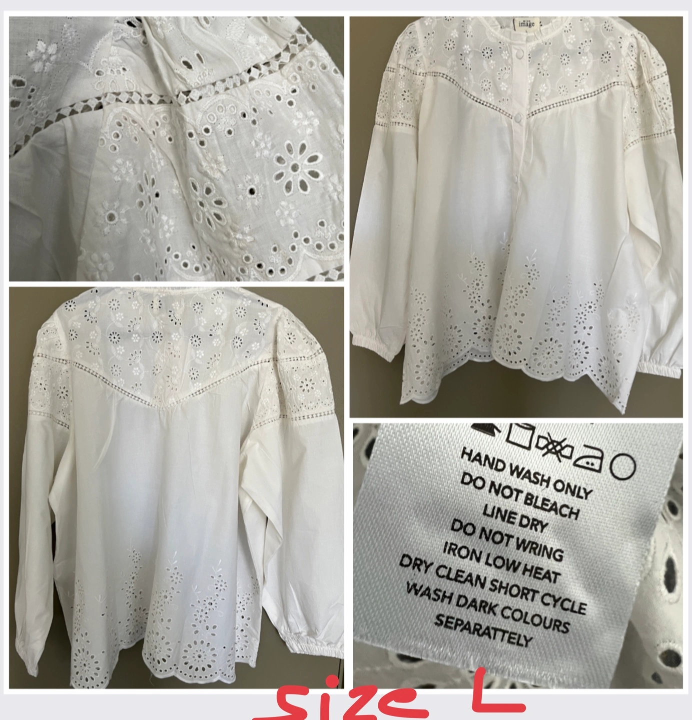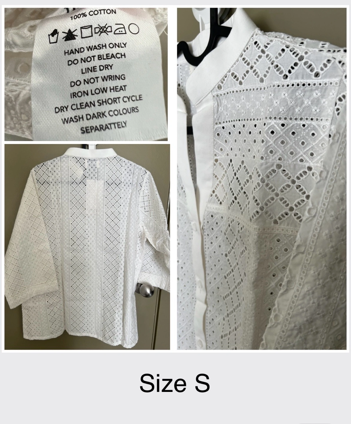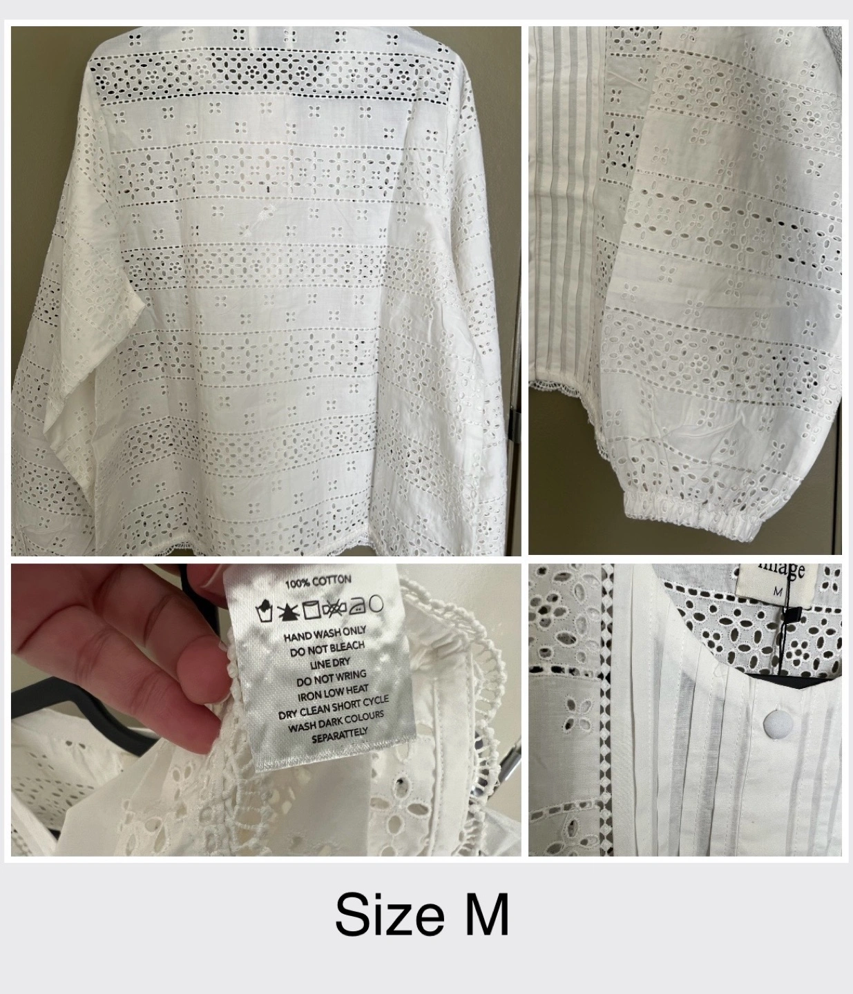 Beautiful white eyelet blouses, perfect for summer. Sizes listed in the pictures. 100% cotton. Hand wash only. Intricate eyelet detailing. Button-front closure. 3/4 or long sleeves. $25 each.