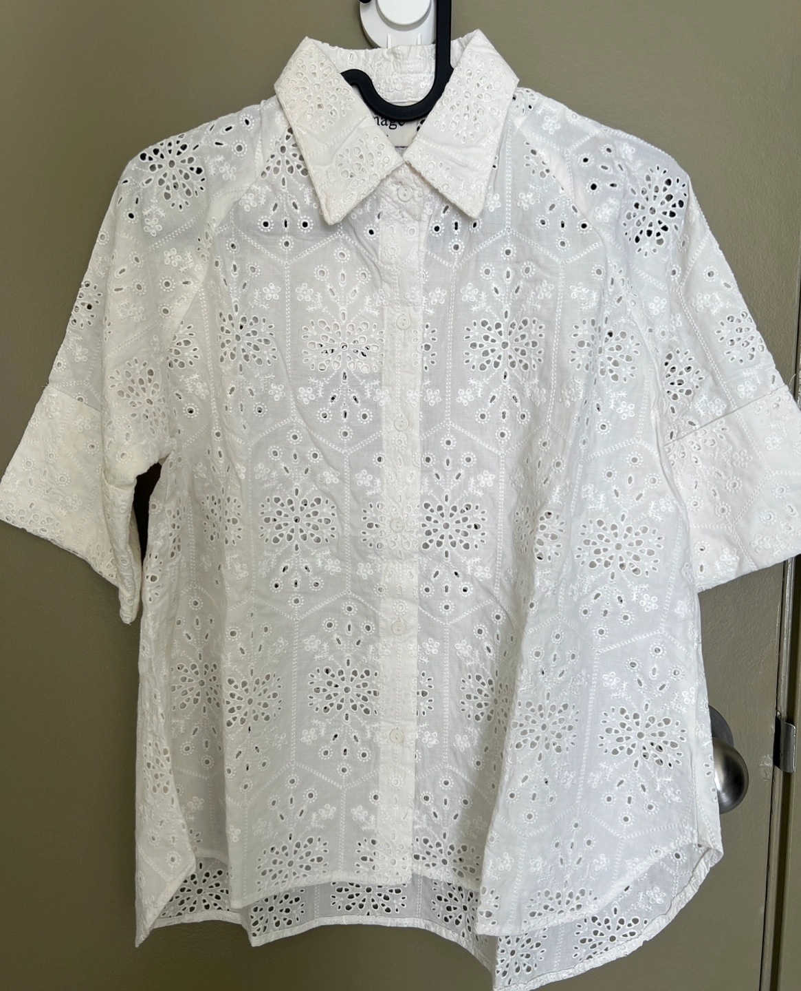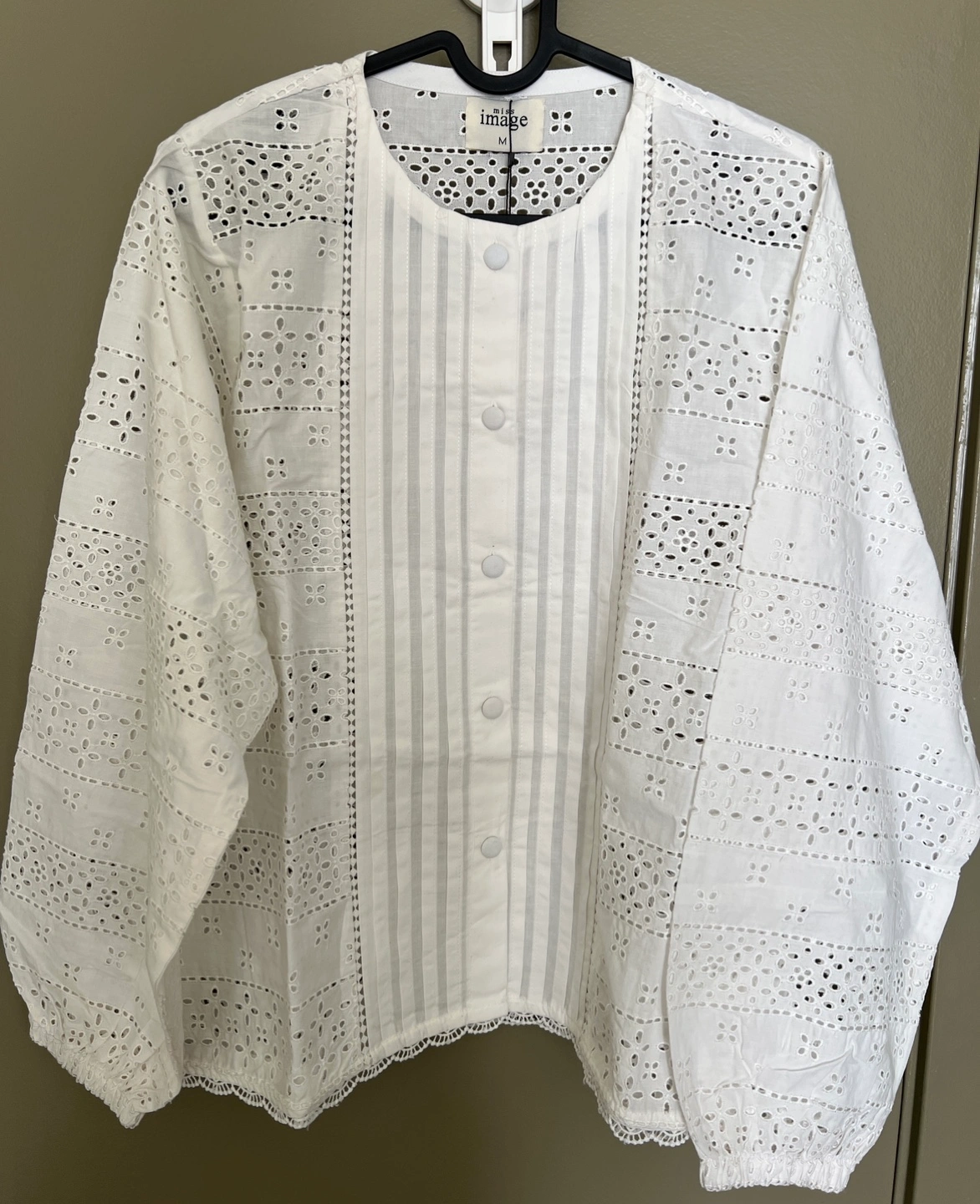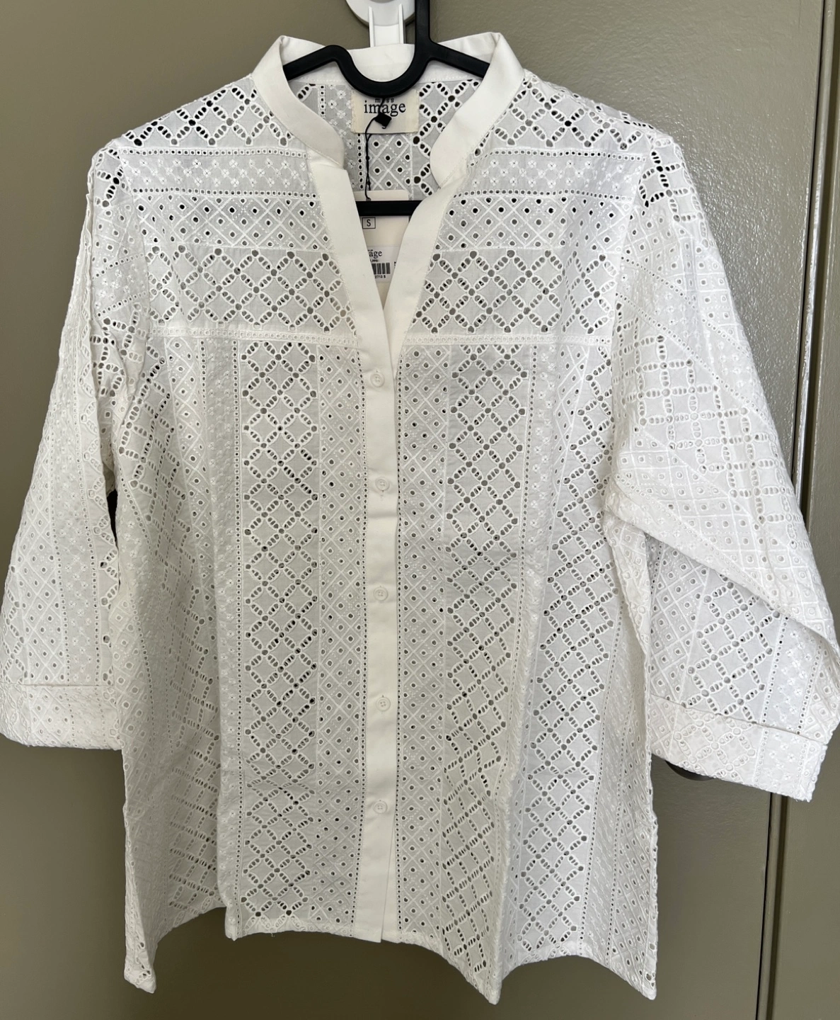 Beautiful white eyelet blouses, perfect for summer. Sizes listed in the pictures. 100% cotton. Hand wash only. Intricate eyelet detailing. Button-front closure. 3/4 or long sleeves. $25 each.