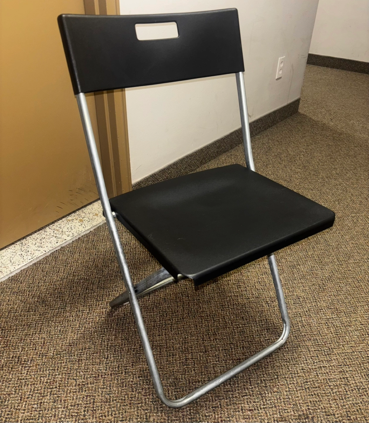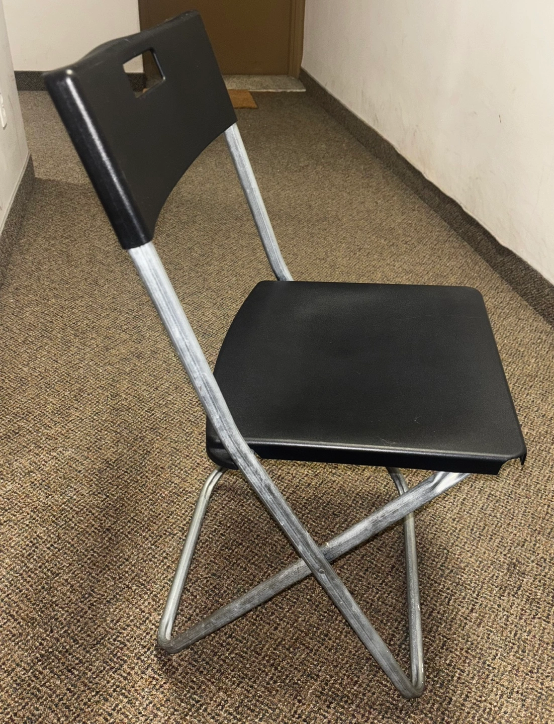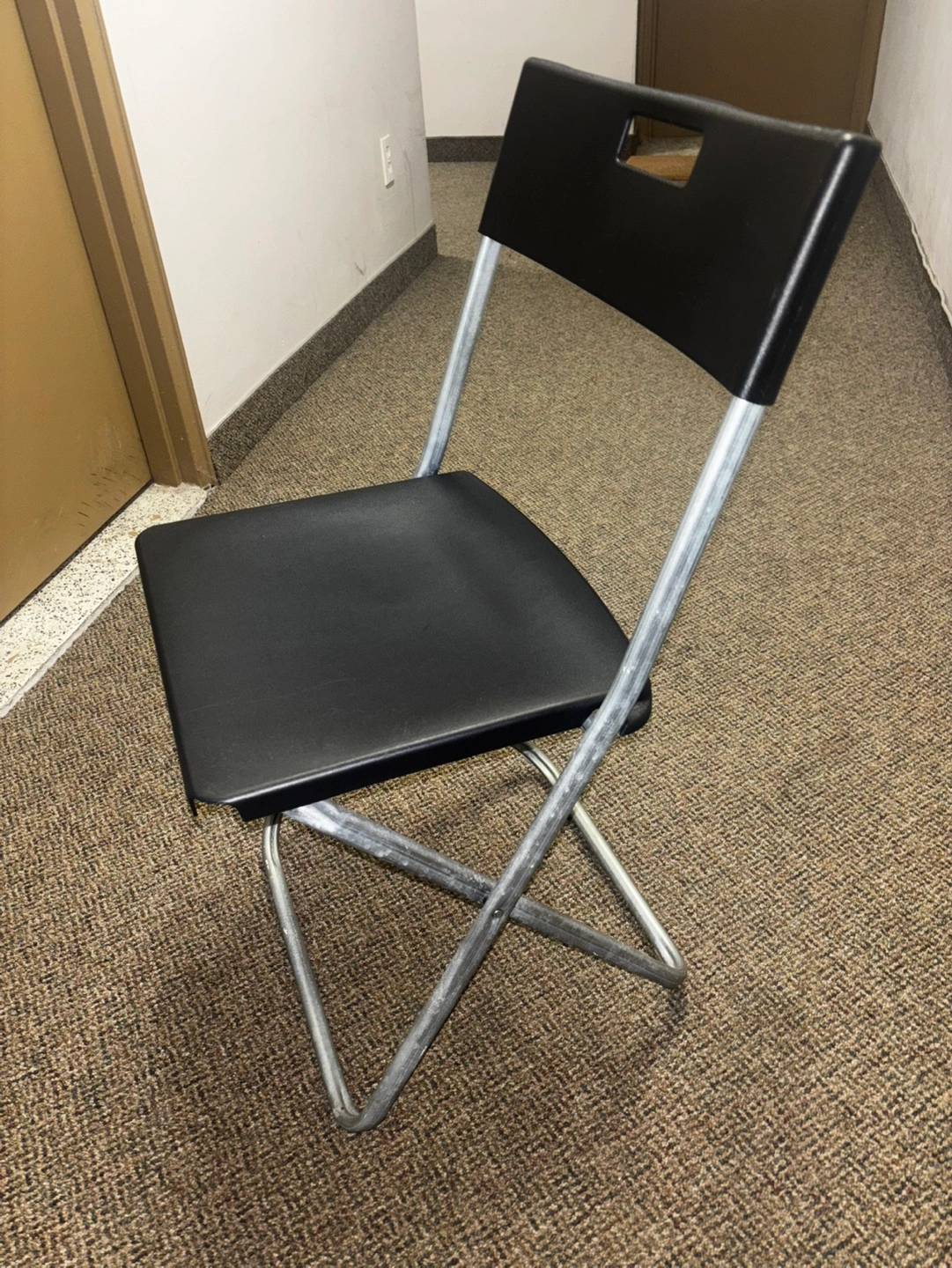 Lightweight and portable folding chair. Black plastic seat and back. Silver metal frame. Easy to store. I have one more left !!! Send your best offer !! Accepting EMT OR CASH ON DELIVERY