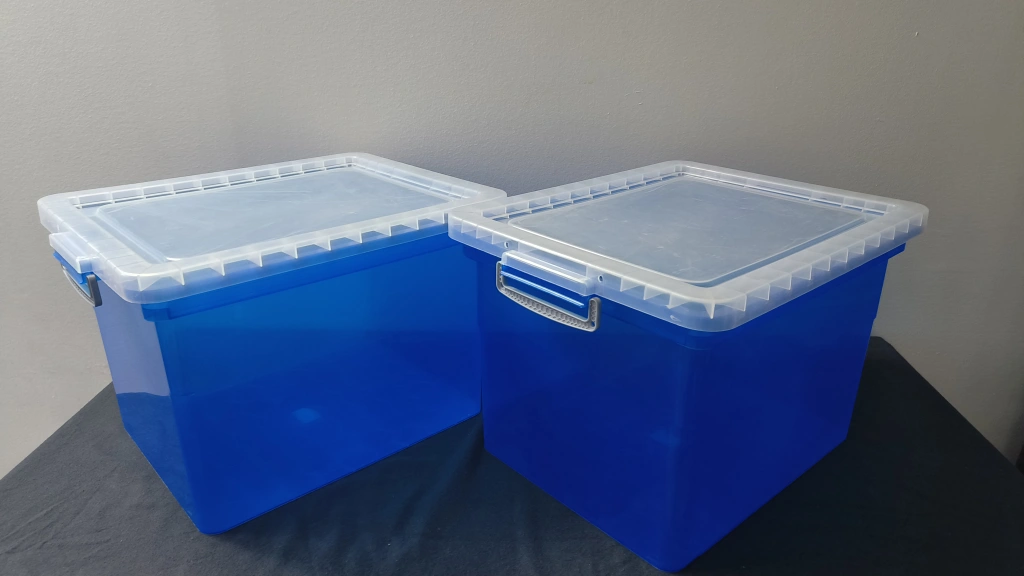 Pair of stackable plastic storage containers. Blue base with clear lids. Durable and great for organization.