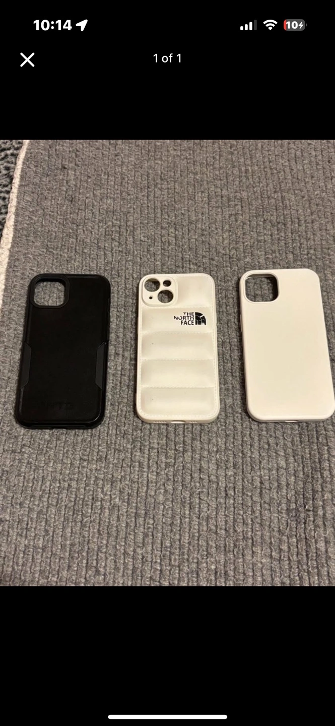 Three iPhone cases. One black, one white The North Face, and one plain white. Various styles. Good condition. North face has a small rip but nothing big everything else in perfect condition.