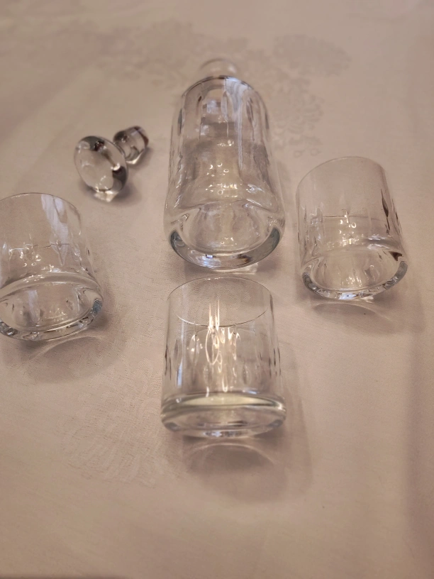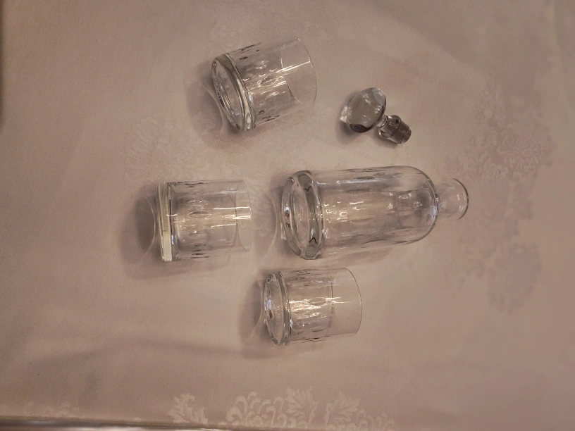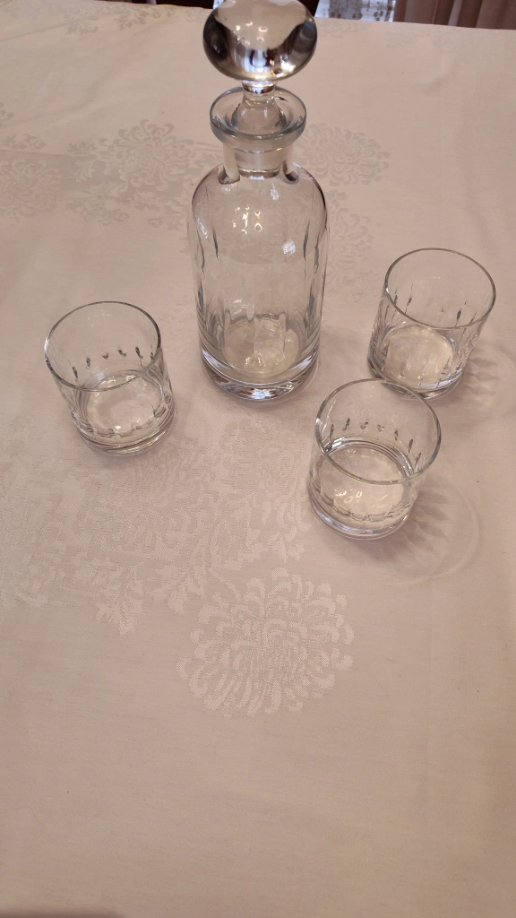 Modern, elegant crystal decanter set. Includes three matching glasses. Beautiful etched detailing. Perfect for entertaining. Never used. No chips, scratches, etc . Asking $50. obo for the set. Pick up in Meadowvale area of Mississauga near Ninth Line and Britannia Rd.