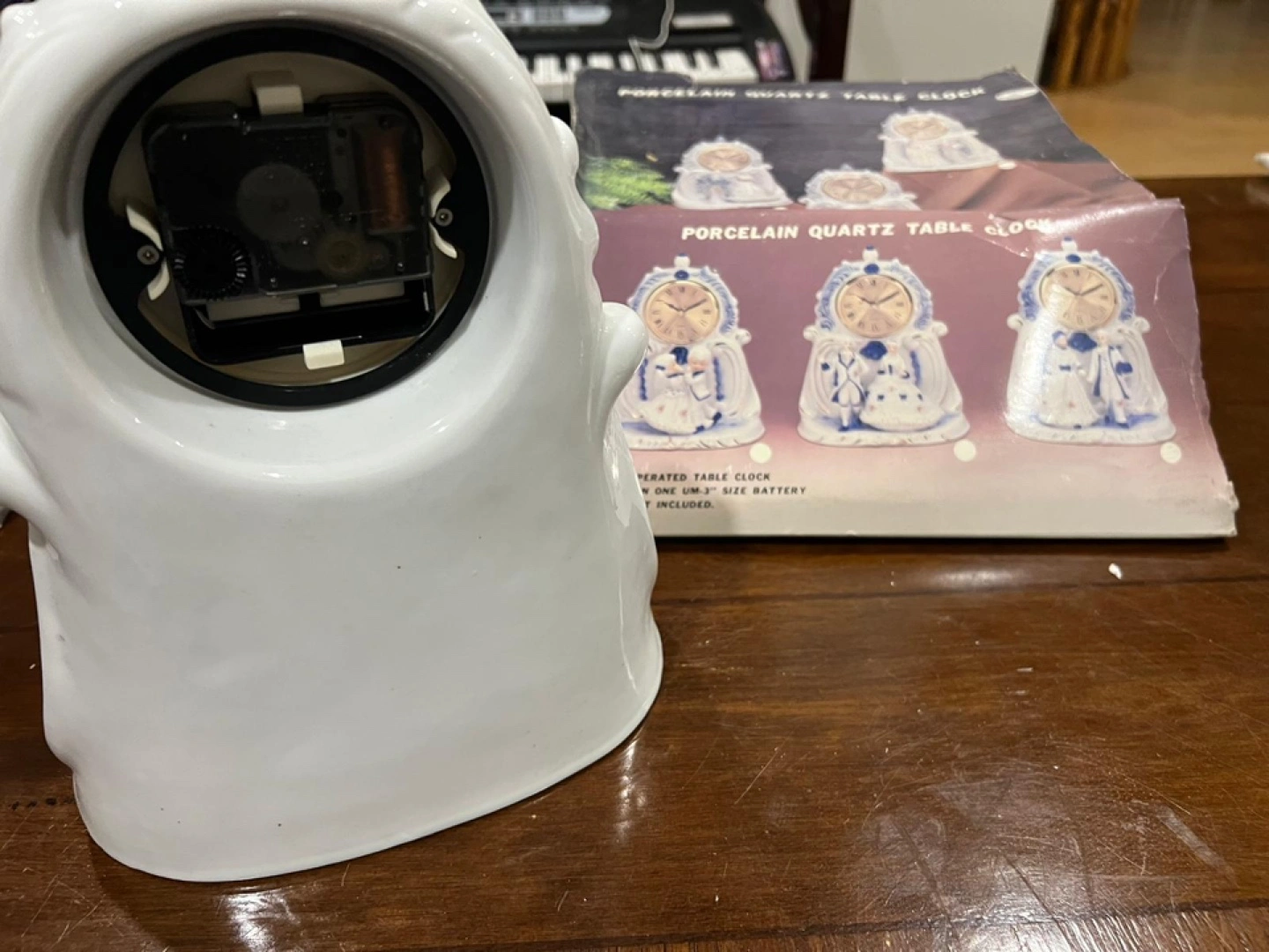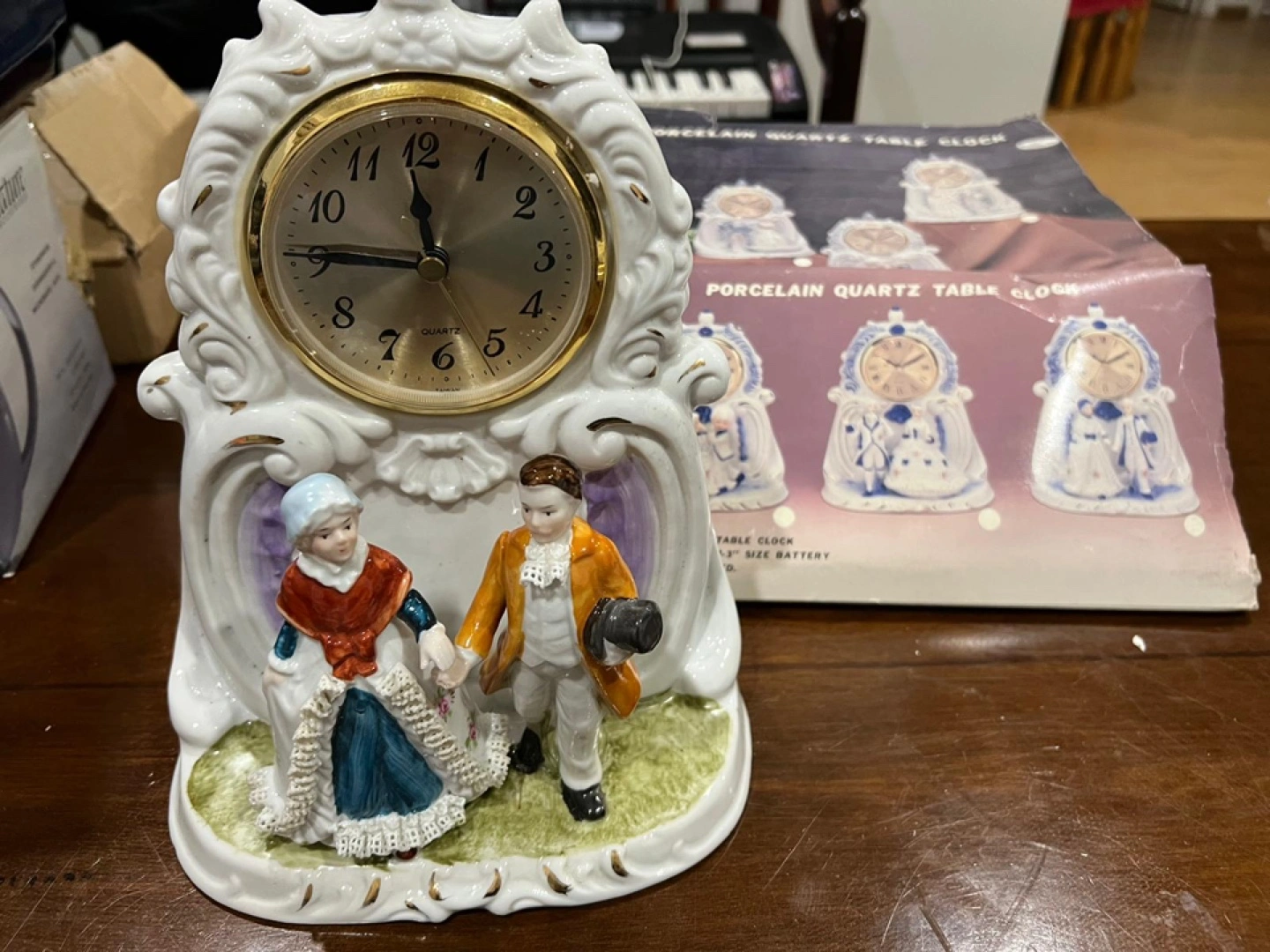 Ornate porcelain clock featuring a quartz movement. Features a charming couple figurine base. Gold accents. Comes with original box.