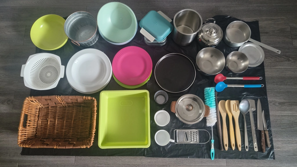 Large bundle of kitchen items. Includes various bowls, plates, a colander, a basket, baking pan, and more. Stainless steel cookware and utensils also included. Perfect for starting a kitchen or adding to your existing collection.