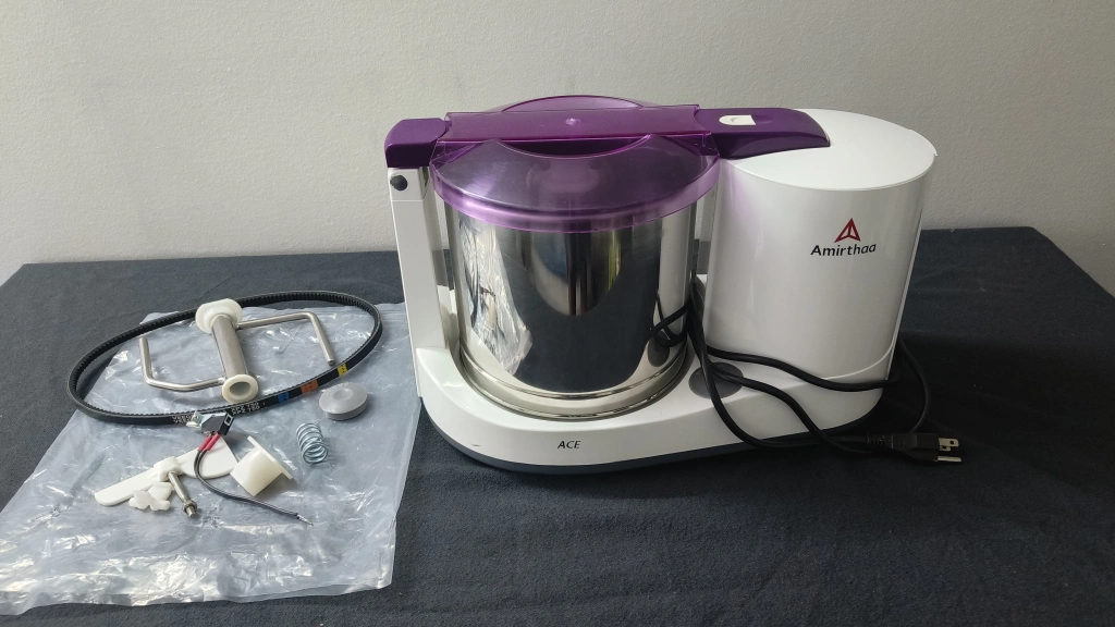 New wet grinder. Includes all parts and additional accessories. Purple accents. Stainless steel grinding chamber.