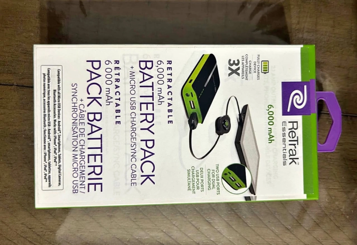 Retractable portable charger. 6000 mAh. Two USB ports for dual charging. Includes micro USB charge/sync cable. Compatible with many devices.