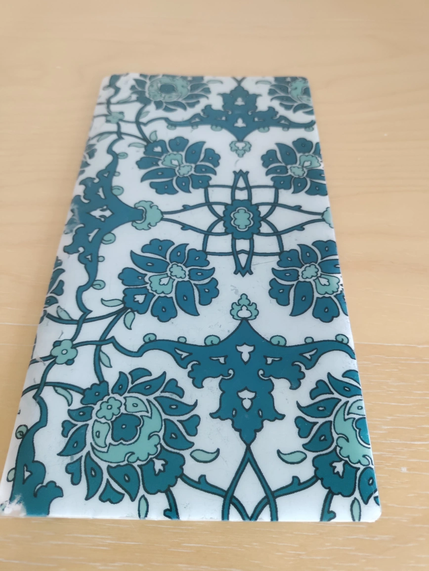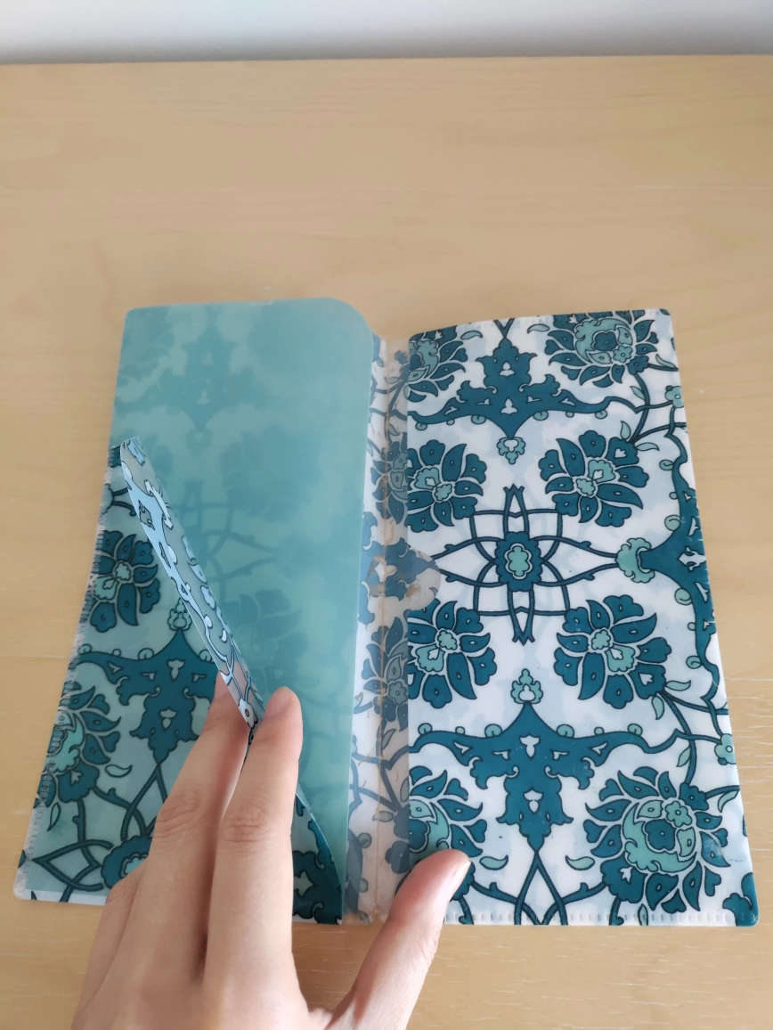 Slim bifold wallet. Teal and white floral pattern. Lightweight and portable. Good for everyday use.
