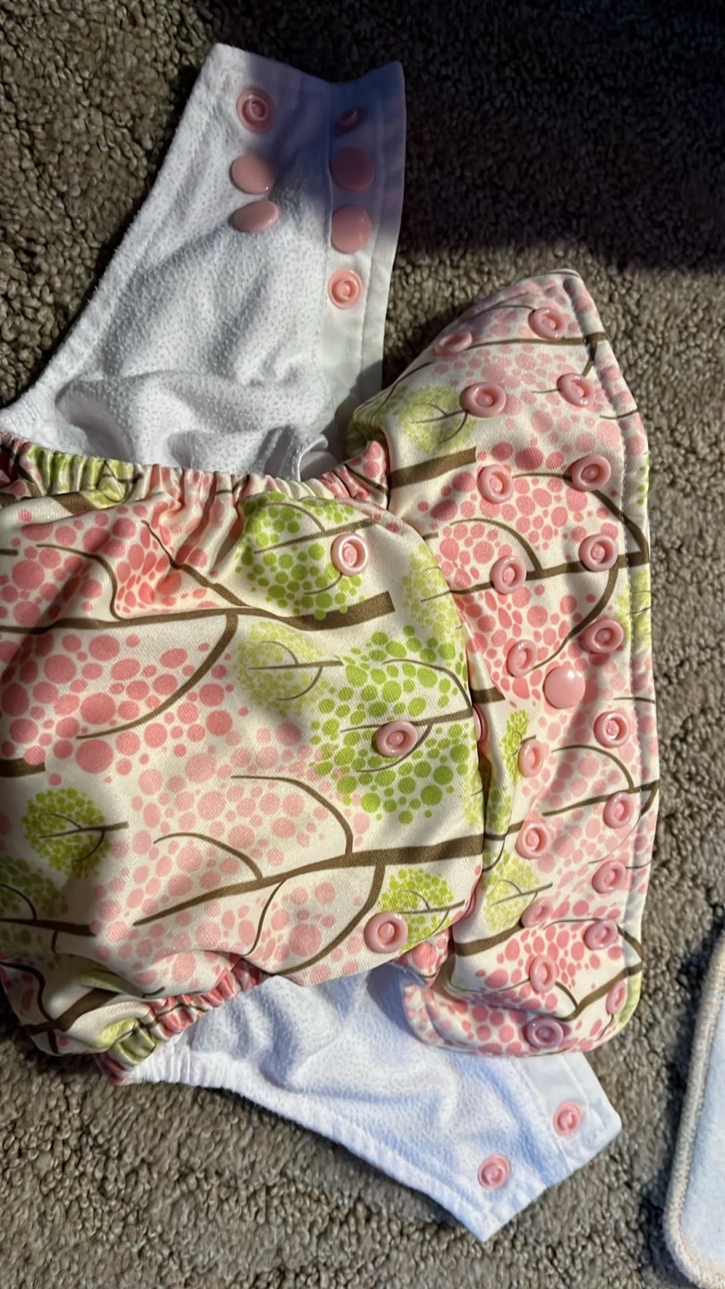 Adorable reusable cloth diaper. Features a lovely blossom print. Includes one diaper and one insert. Snappy closures. Soft and absorbent. Great for environmentally conscious parents.