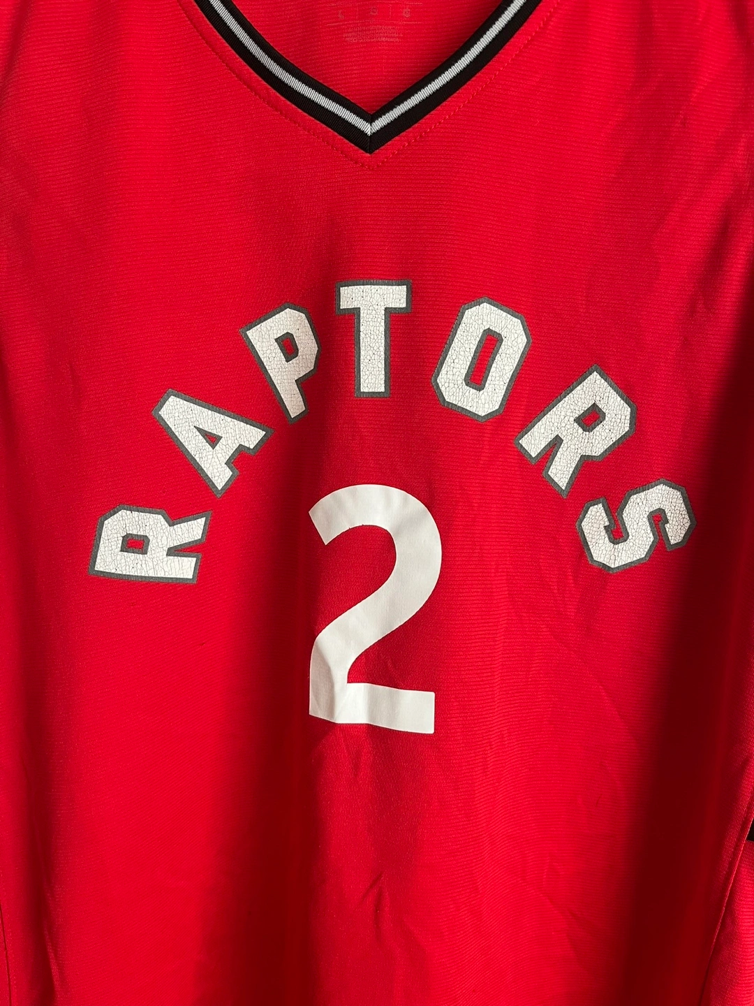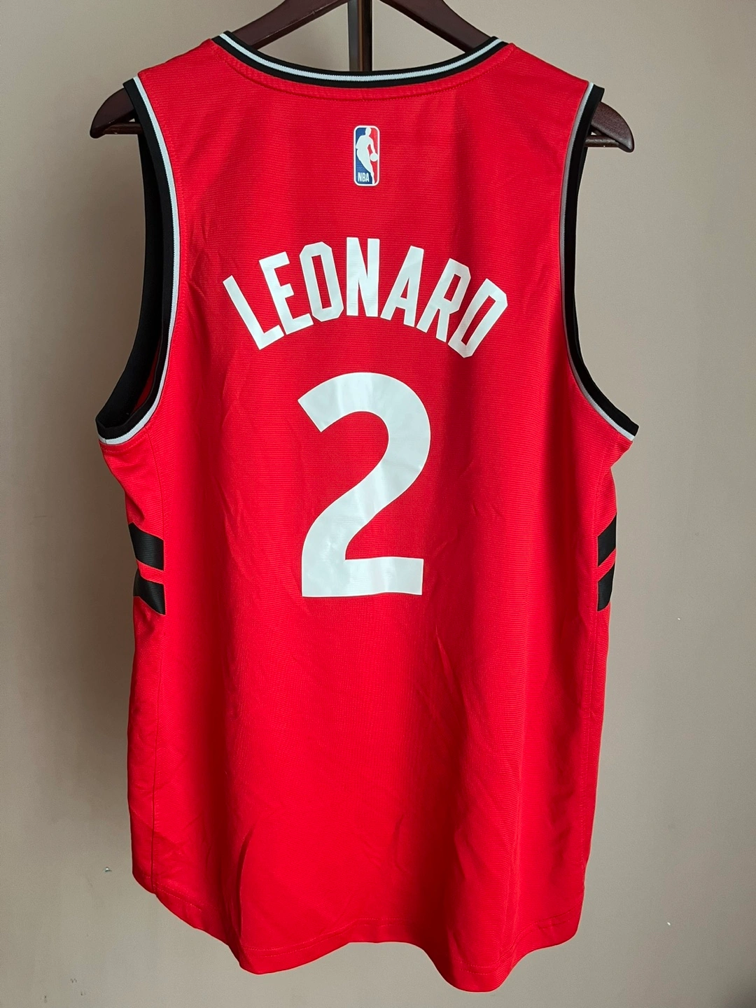 Men's red Toronto Raptors jersey. Features Kawhi Leonard's name and number 2. Fanatics brand. Large Men’s