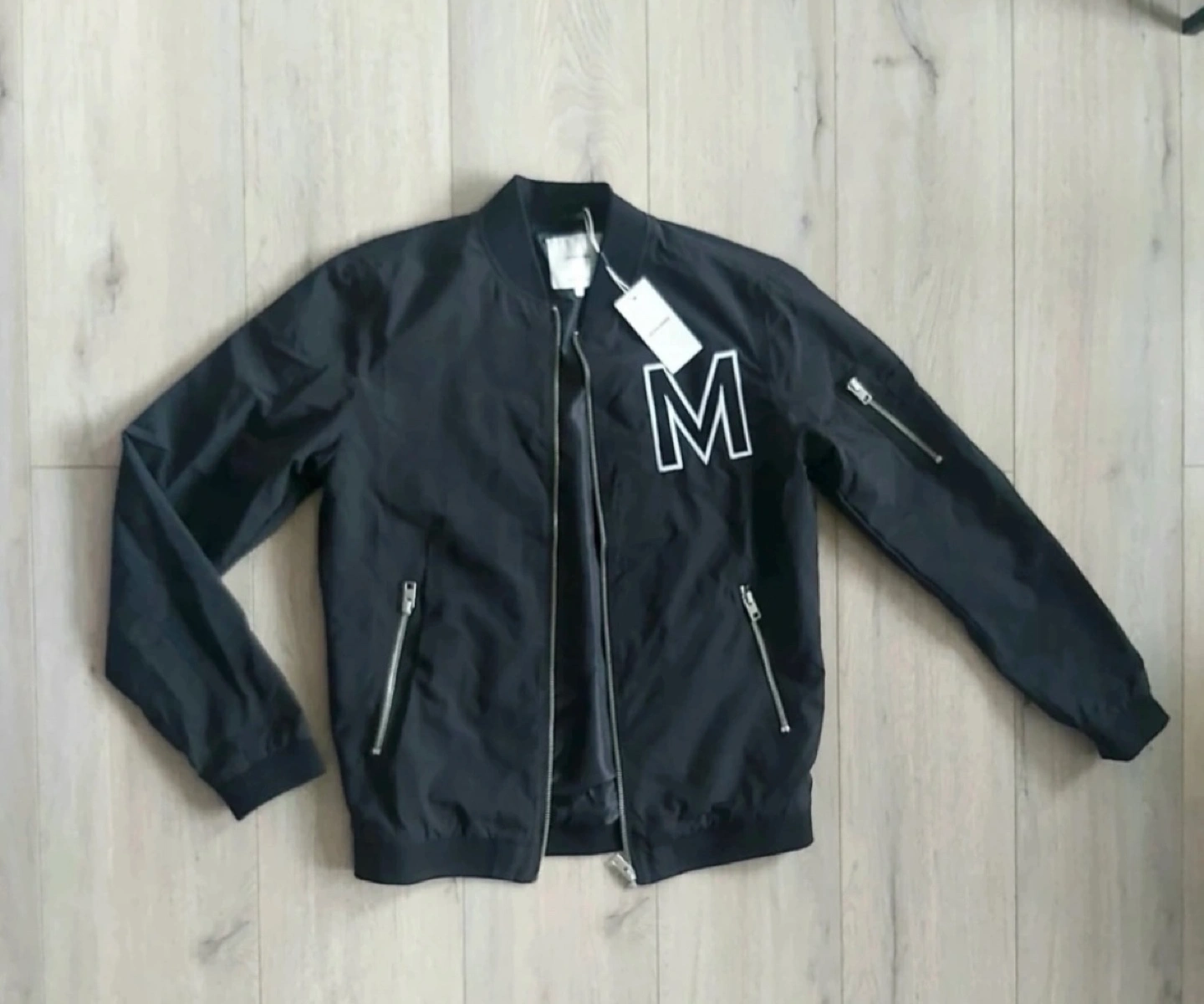 Black bomber jacket. Features a large white 'M' on the chest. Zip closure. Two zippered pockets. Brand new with tags.🥰
