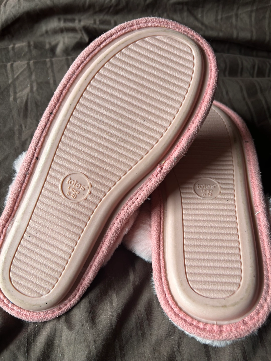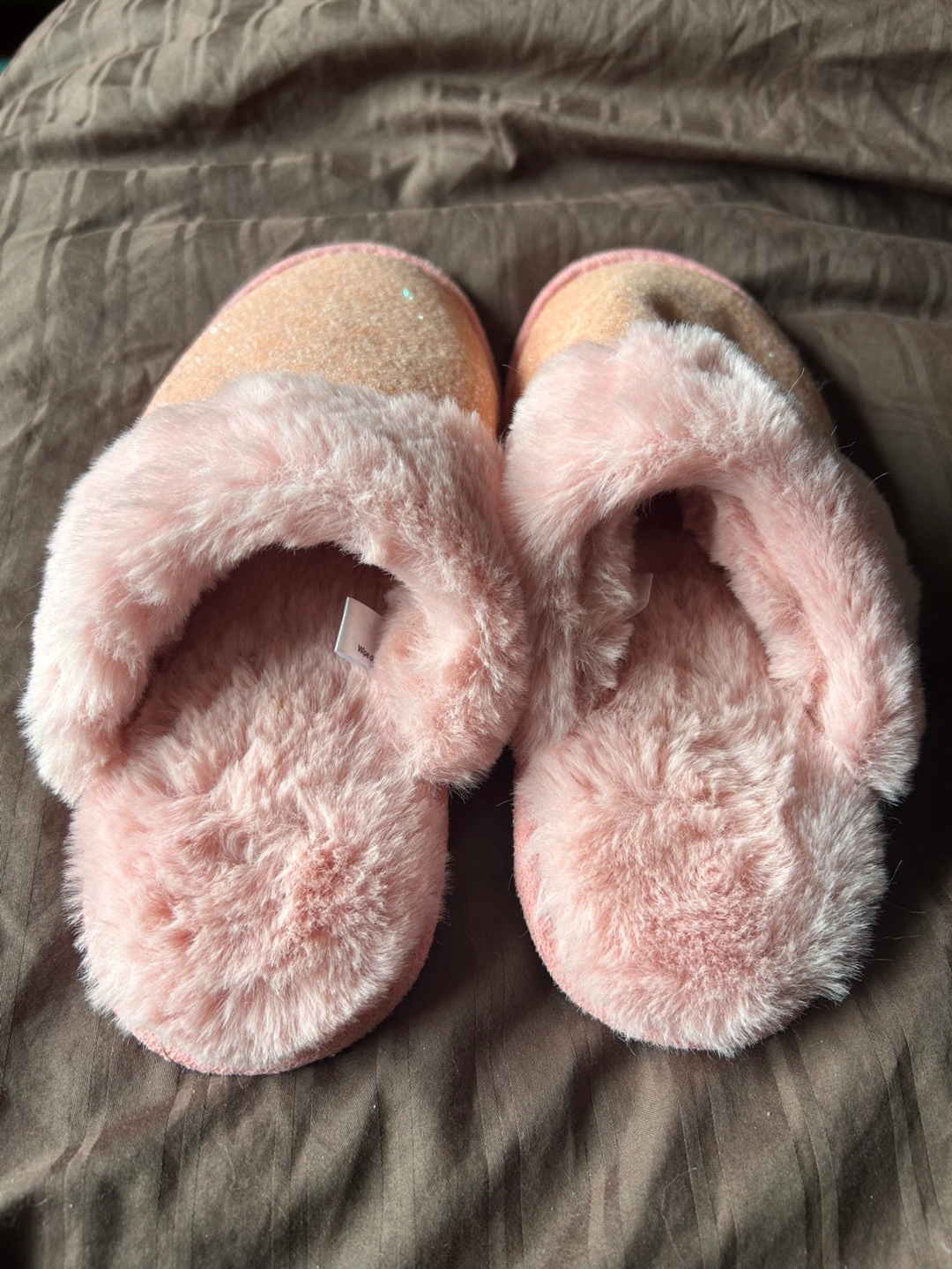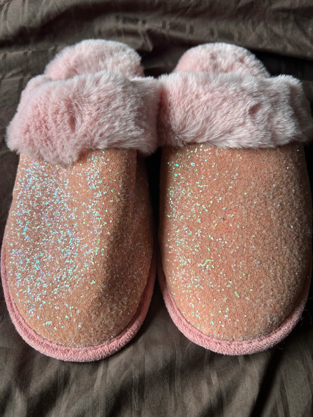 Cozy pink slippers. Glitter upper. Fuzzy lining. Size 9-10. Great for lounging.