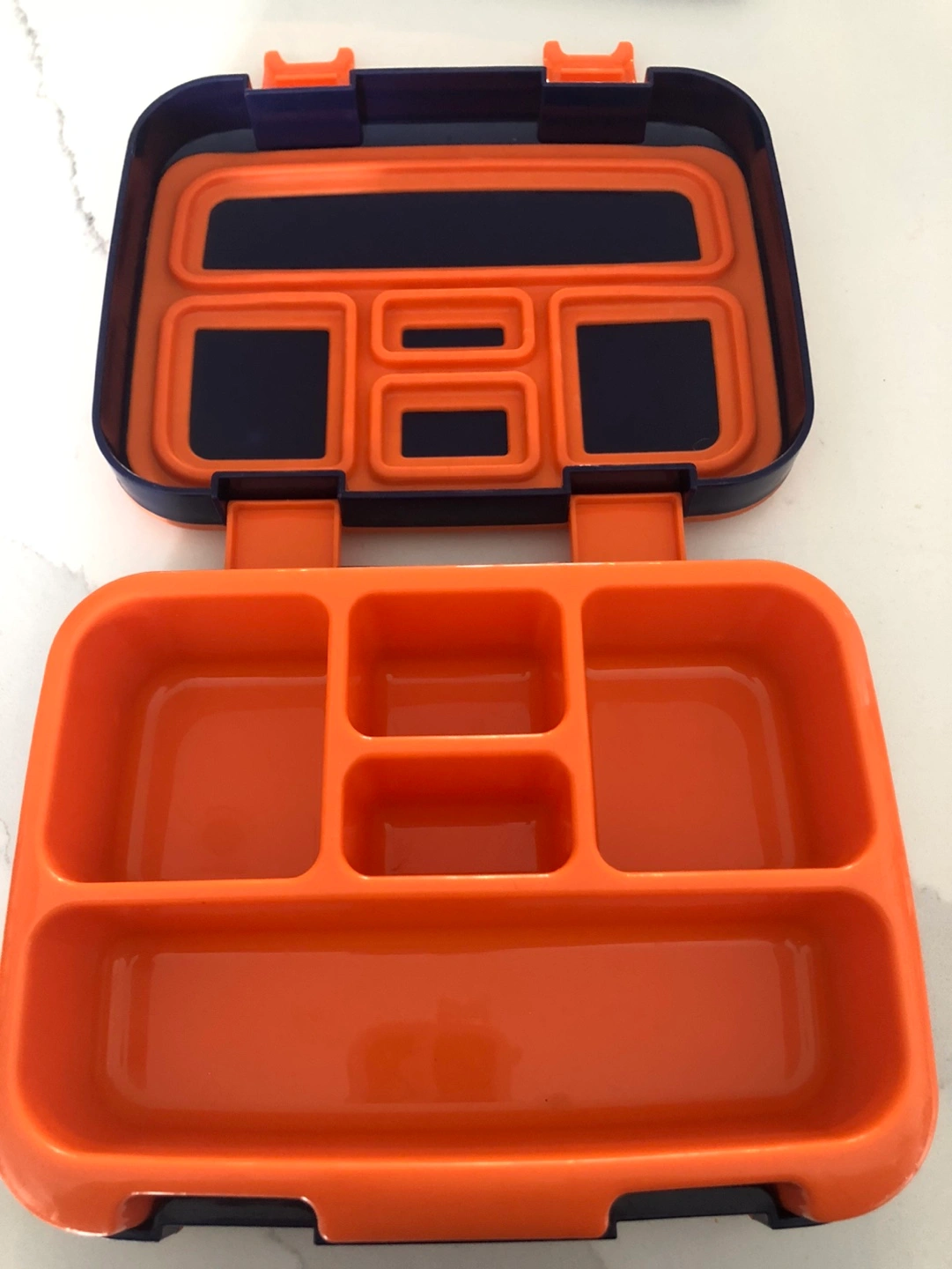 Orange and navy blue bento box. Five compartments. Dinosaur design on the lid. Great for kids' lunches. This was new and never used, but it was kept in storage for a while, so the outside is a bit dirty. Outside of the lunch box will require a bit of cleaning. Free. Pick up in Pickering (Altona & Kingston).