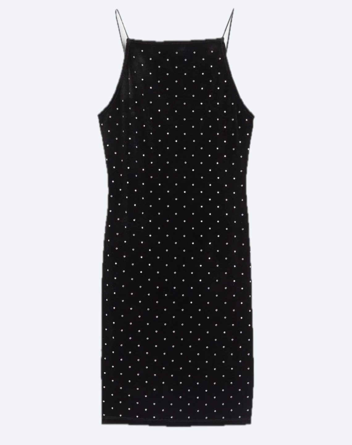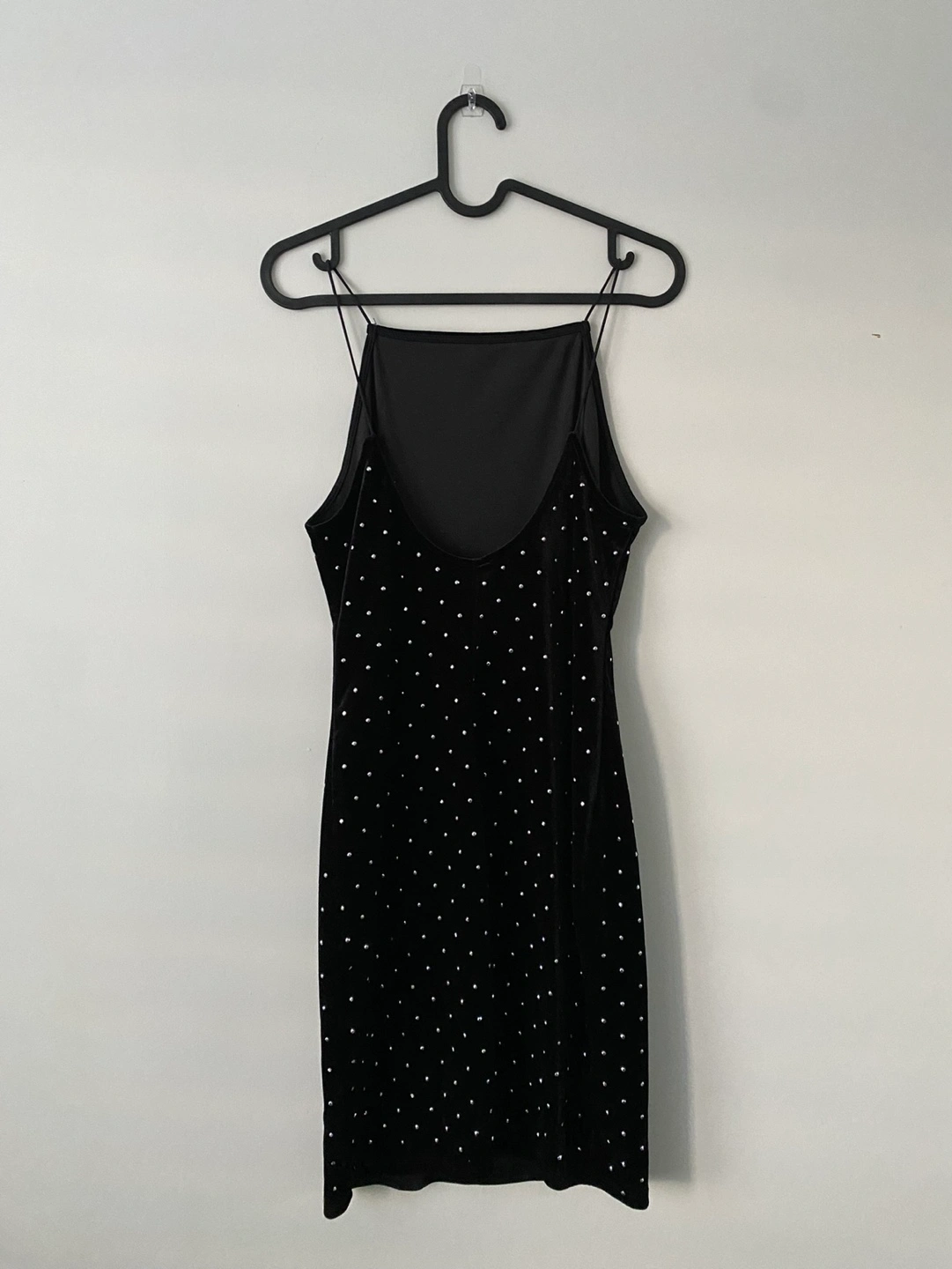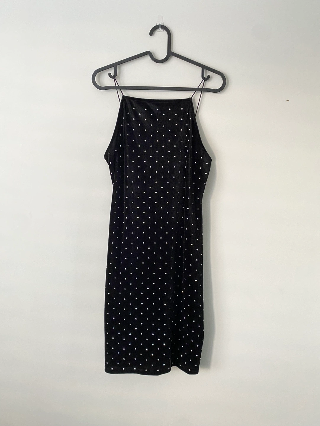 and is perfect for a night out. π Medium black velvet mini dress. π Features delicate straps π Sparkling rhinestones π Size M