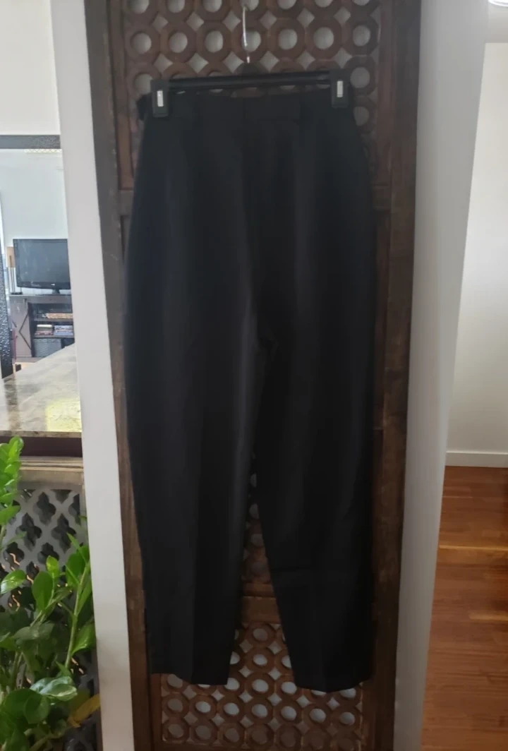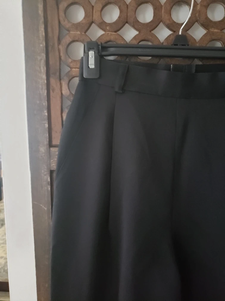 Black high-waisted trousers. Classic pleat style. Zip and button side closure. Great fit.