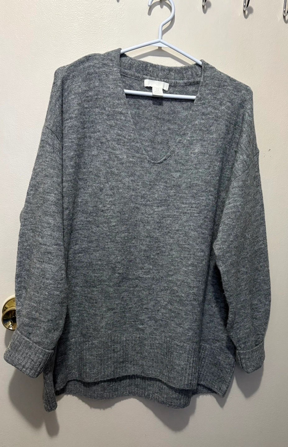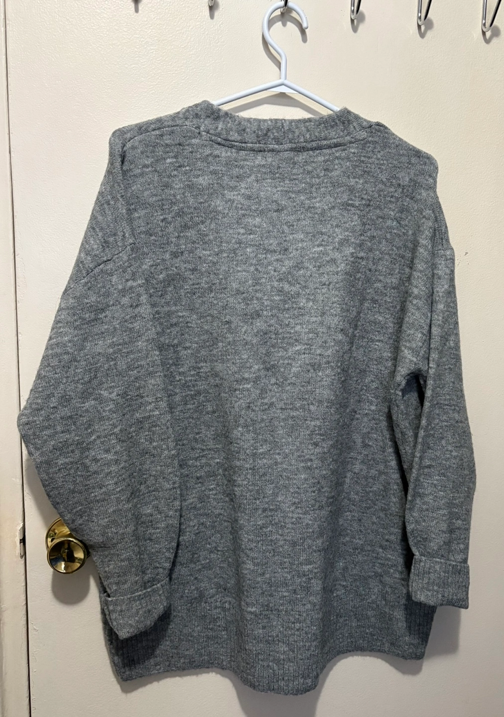 Grey V-neck sweater. Long sleeves. Medium size. Soft knit material. Relaxed fit.