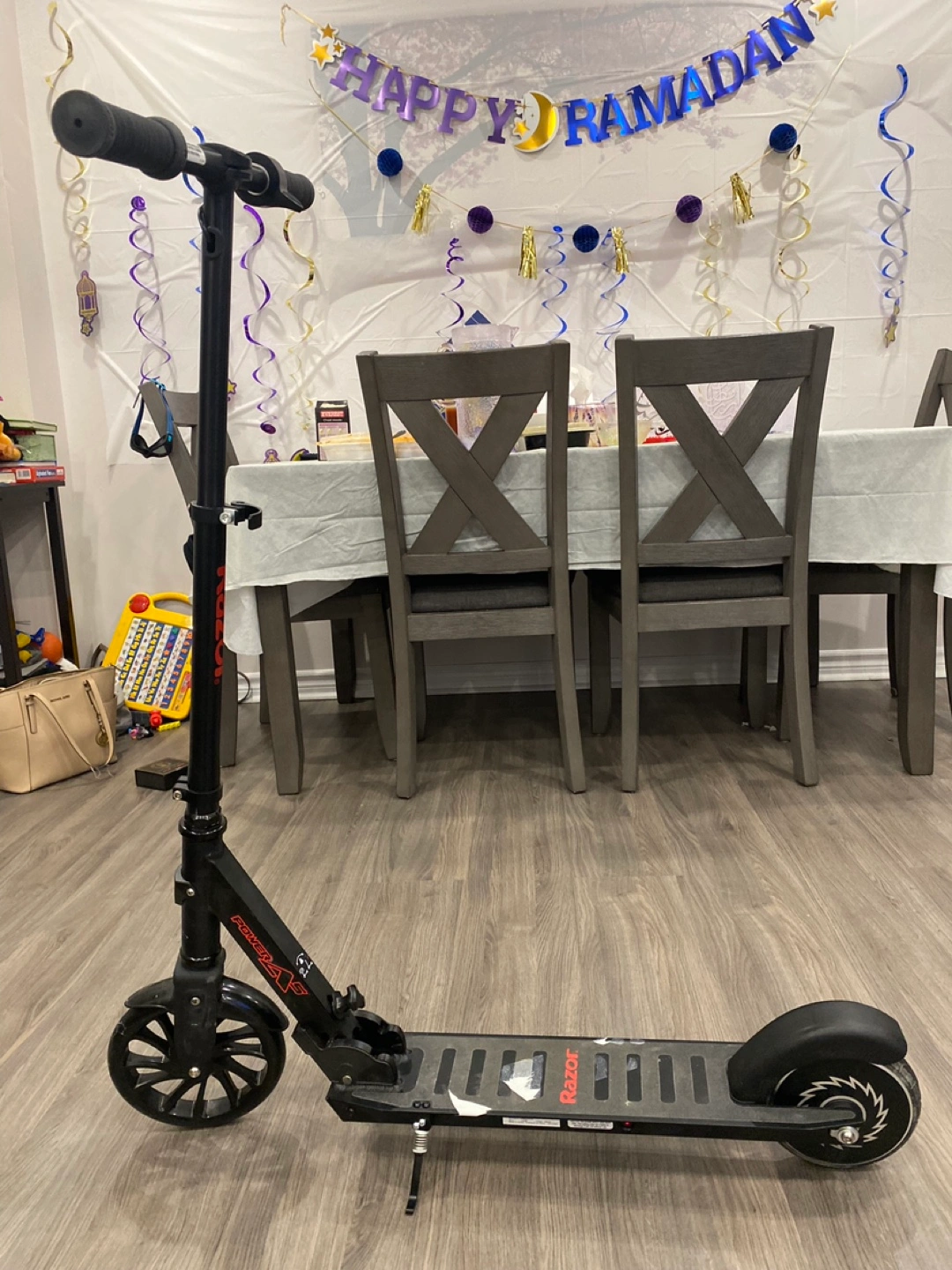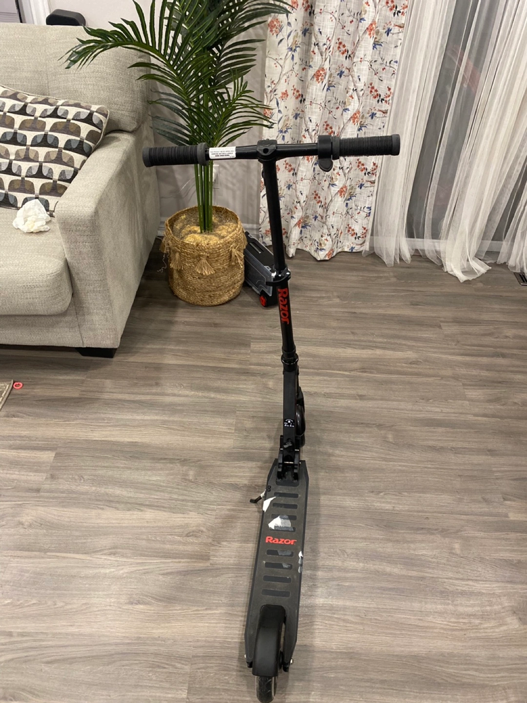 Black electric scooter. MISSING CHARGER Great condition. Folds for easy storage. Perfect for commuting or recreation. Goes 16KPH and lasts 1hr Pick ups only Cash or et accepted