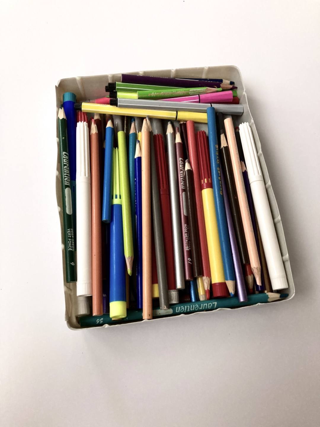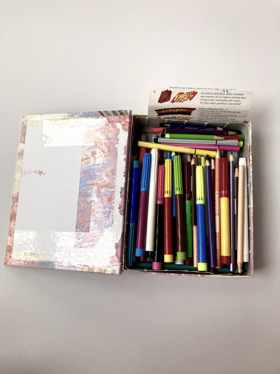 Box contains: Laurentien pencil crayons (various lengths) Magic markers (unused, several years old) The Drawing Course by Angela Gair (good condition, ~40 pages.) Good for younger kids or new artists to try out at no cost. :) I have other crafty listings up; I’d recommend picking up multiple things in bulk if interested.