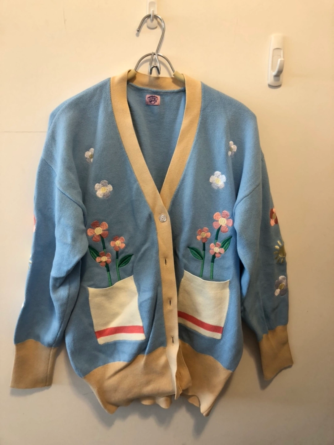 Light blue cardigan. Features embroidered flowers and suns. Beige coloured trim. Two pockets. Button closure. Bought it at $100, selling at $55 Cash/E-transfer only First come first serve Deals if combined with my other listings